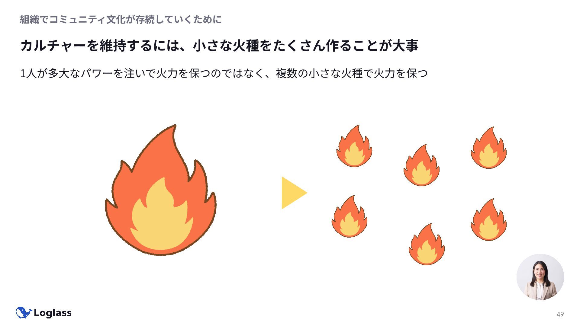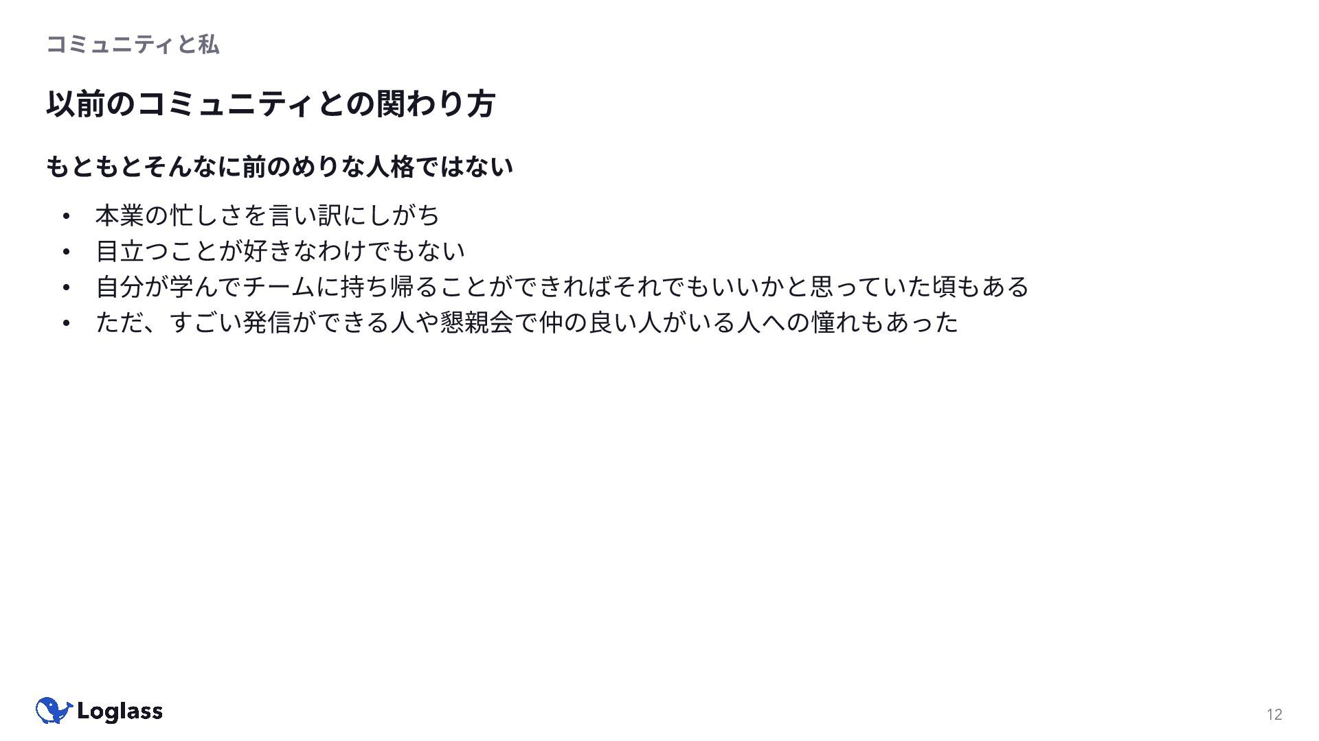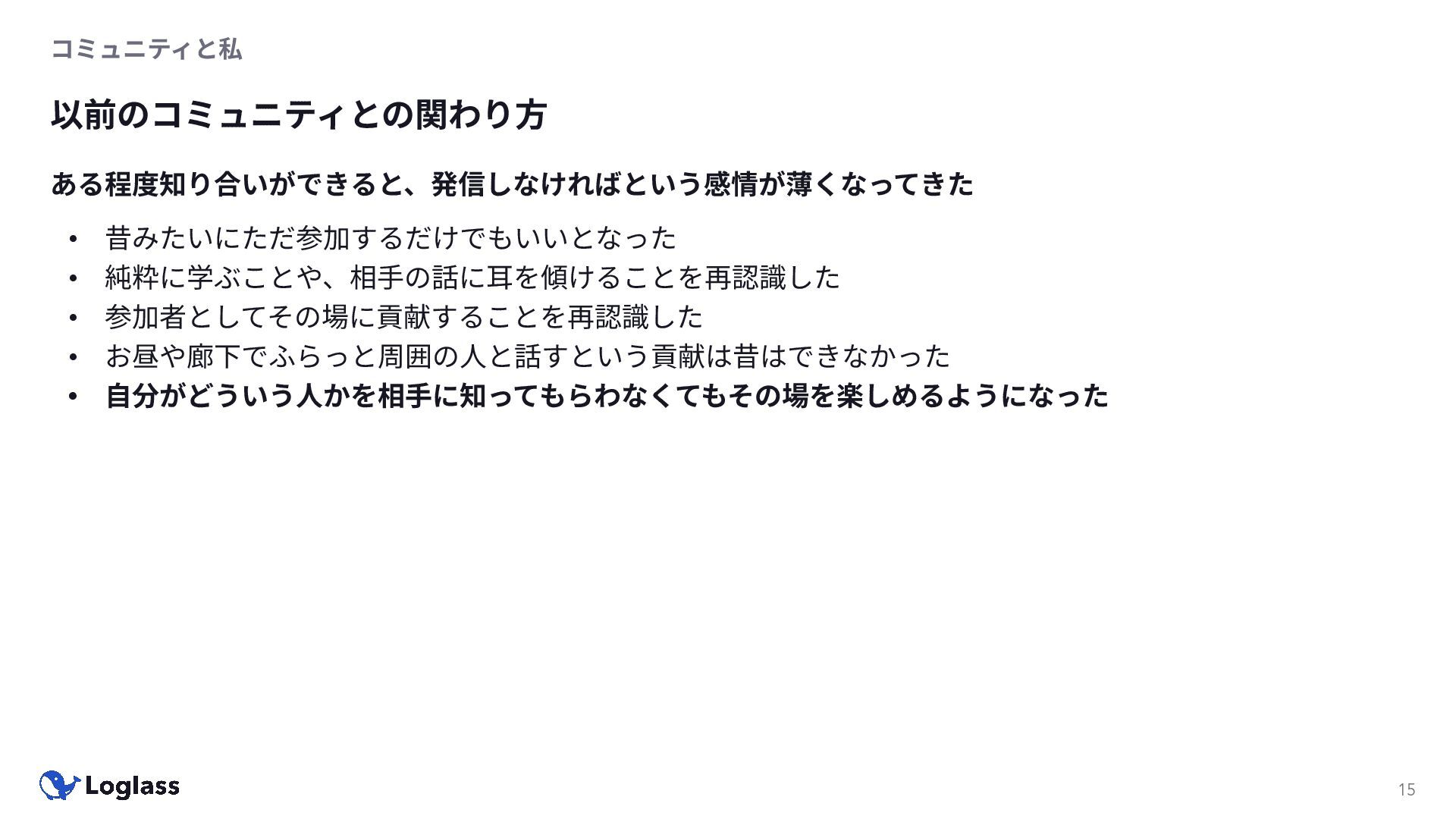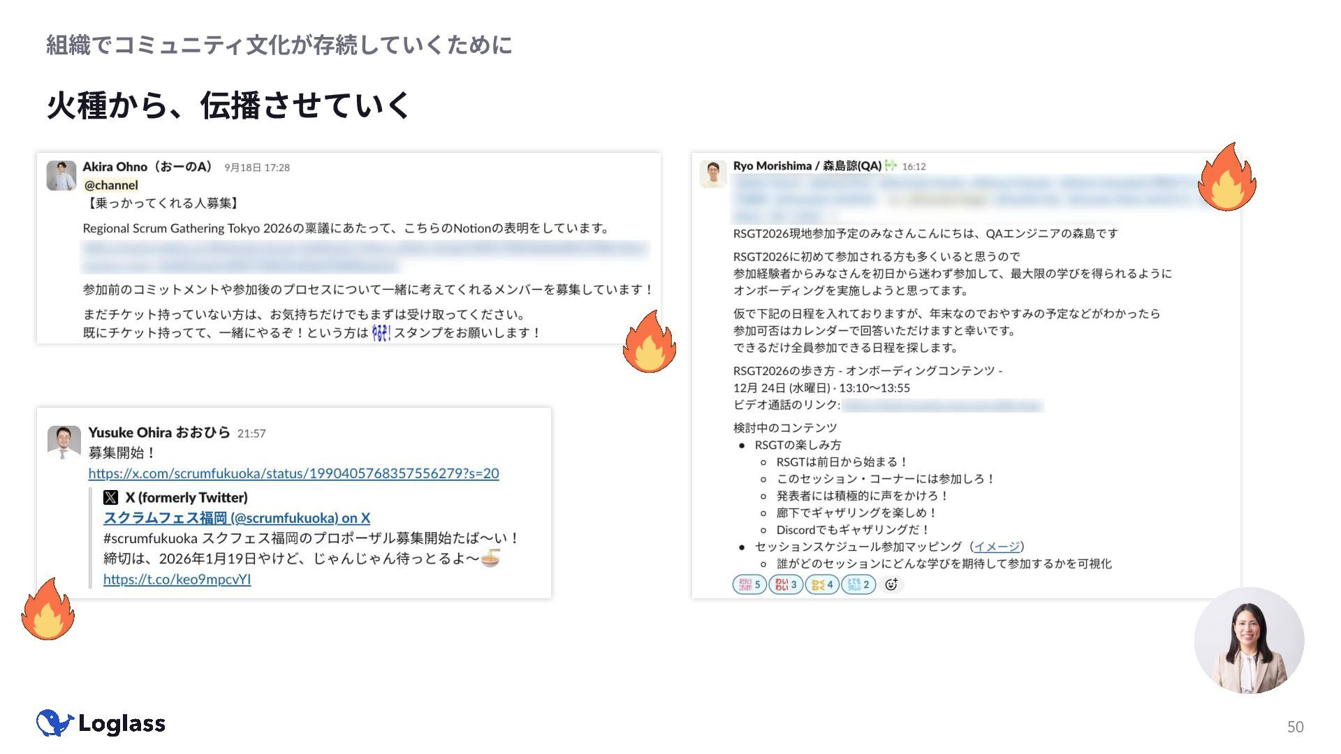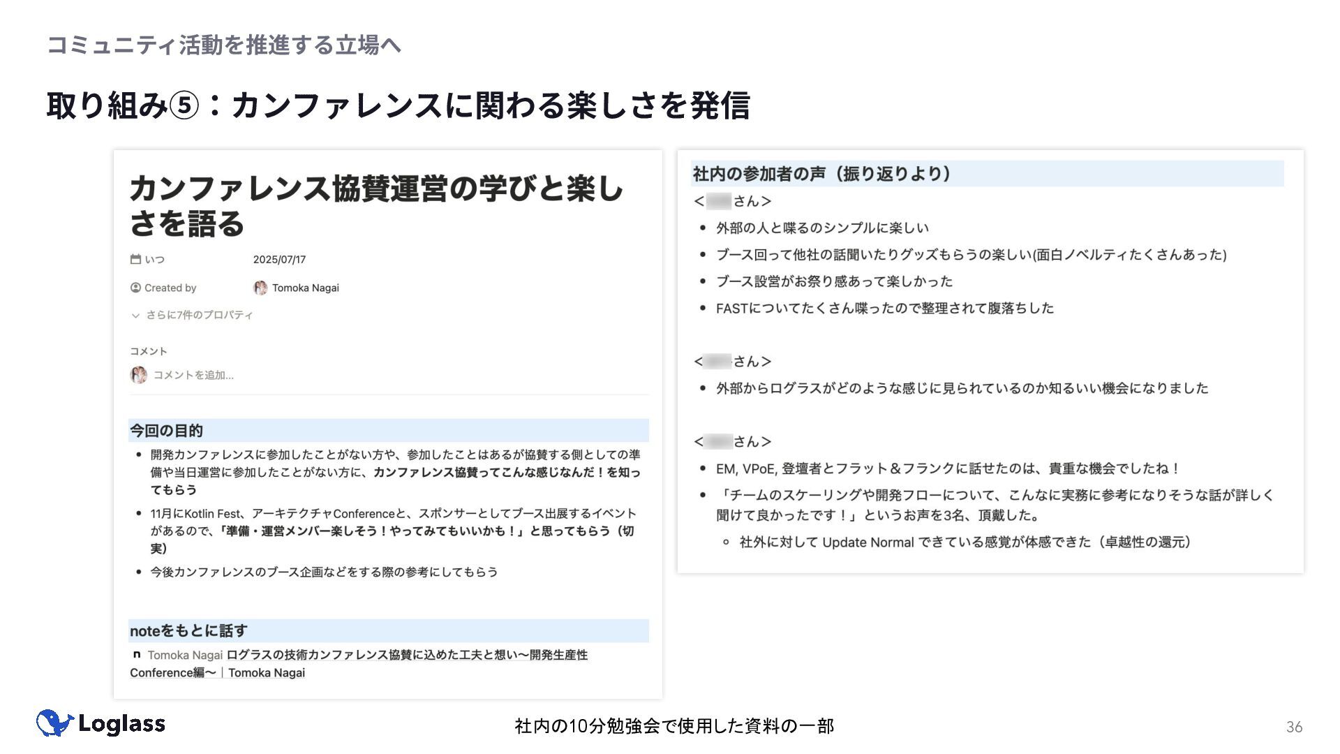 ‐ 短期ではなく⻑期で • 採⽤ブランディングだけでなく、コミュニティに出ていくこと⾃体に⻑期的な学びの価値がある ‐ ⼩さくても⻑く継続させる ‐ スポンサーができる = 会社の中でそのコミュニティへの投資を説明できる⼈がいる ‐ 活動を継続し、ブランディングができれば、新たに参加する参加者のハードルも下げることができる • こうした活動に説得⼒を持たせるのは、⾃⾝がそのコミュニティで⻑く活動していればそのほうがやりや すい ‐ 会社に貢献しようとした時に⼀朝⼀⼣でコミュニティとの繋がりを作ることは難しい ‐ 個⼈のためでもあり、会社のためにも、薄くても⻑く活動を継続することは価値がある 会社の中にコミュニティ⽂化を持ち込む 会社を巻き込む 20