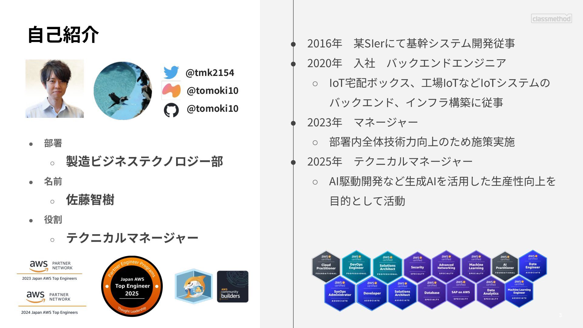 2023年 マネージャー ◦ 部署内全体技術⼒向上のため施策実施 • 2025年 テクニカルマネージャー ◦ AI駆動開発など⽣成AIを活⽤した⽣産性向上を ⽬的として活動 • 部署 ◦ 製造ビジネステクノロジー部 • 名前 ◦ 佐藤智樹 • 役割 ◦ テクニカルマネージャー @tmk2154 @tomoki10 @tomoki10