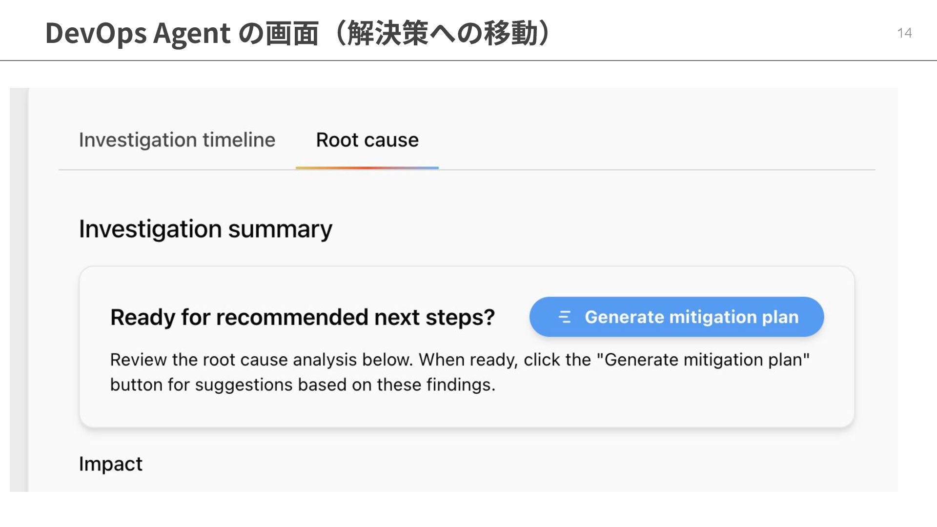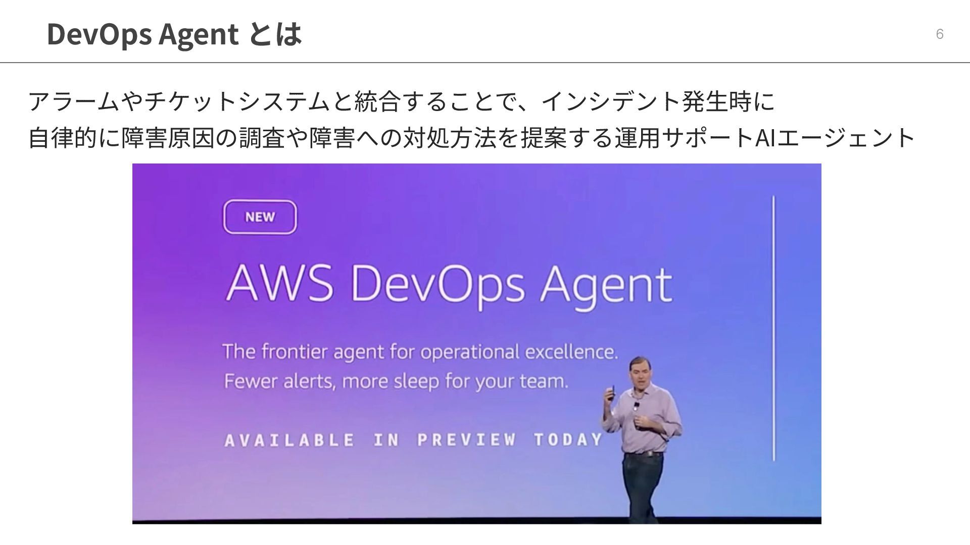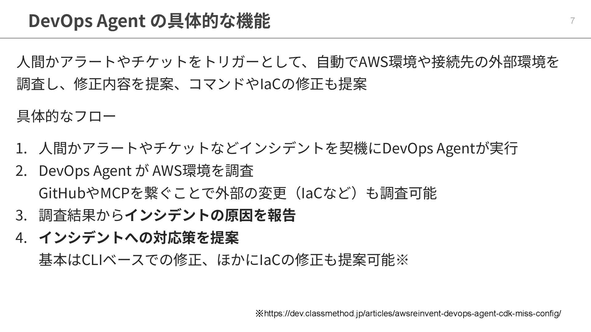 2. ⼈間かアラートやチケットをトリガーとして、⾃動でAWS環境や接続先の外部環境を 調査し、修正内容を提案、コマンドやIaCの修正も提案 具体的なフロー 1. ⼈間かアラートやチケットなどインシデントを契機にDevOps Agentが実⾏ 2. DevOps Agent が