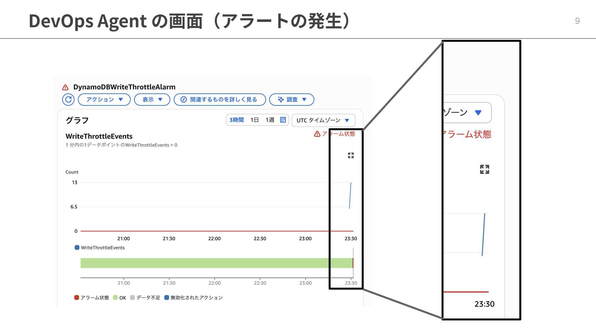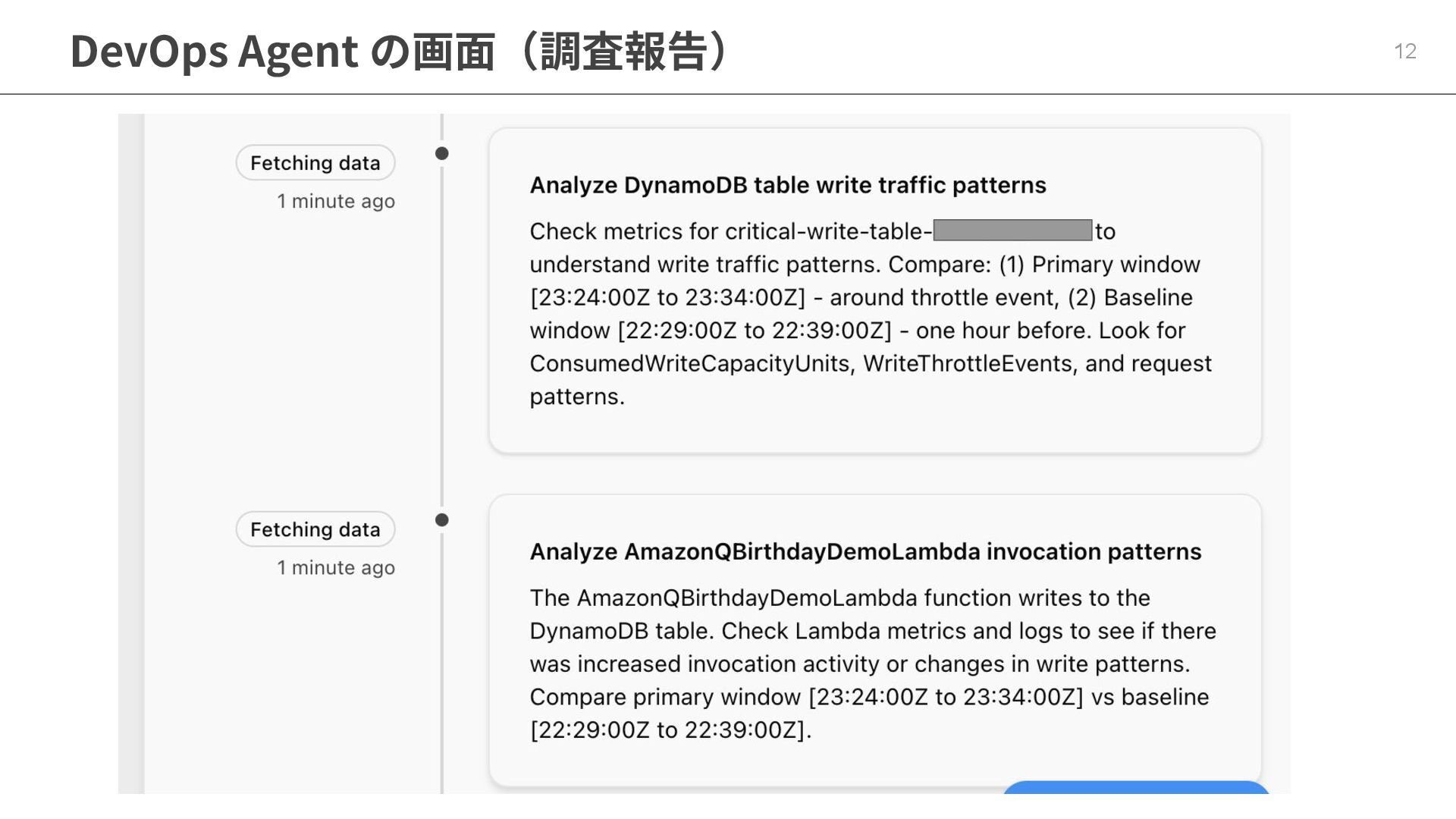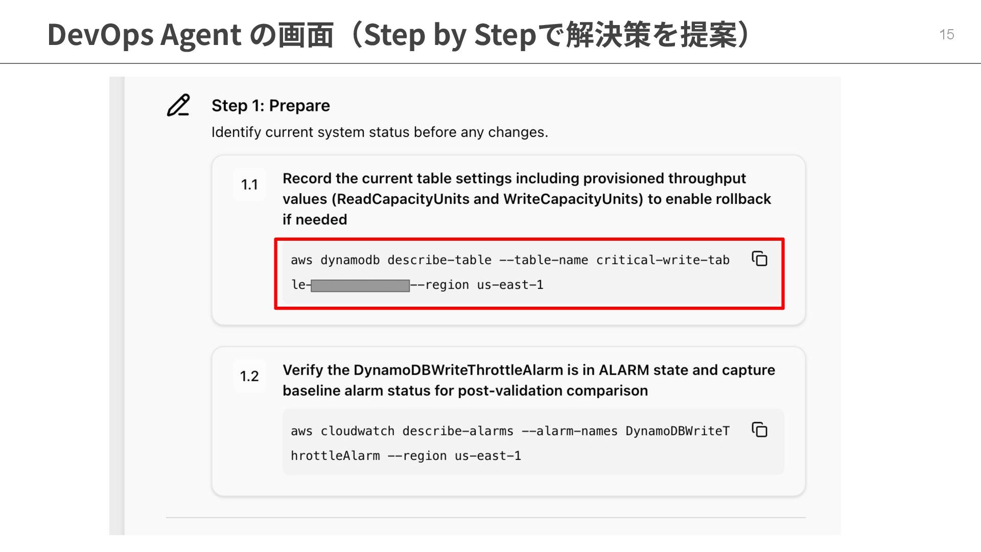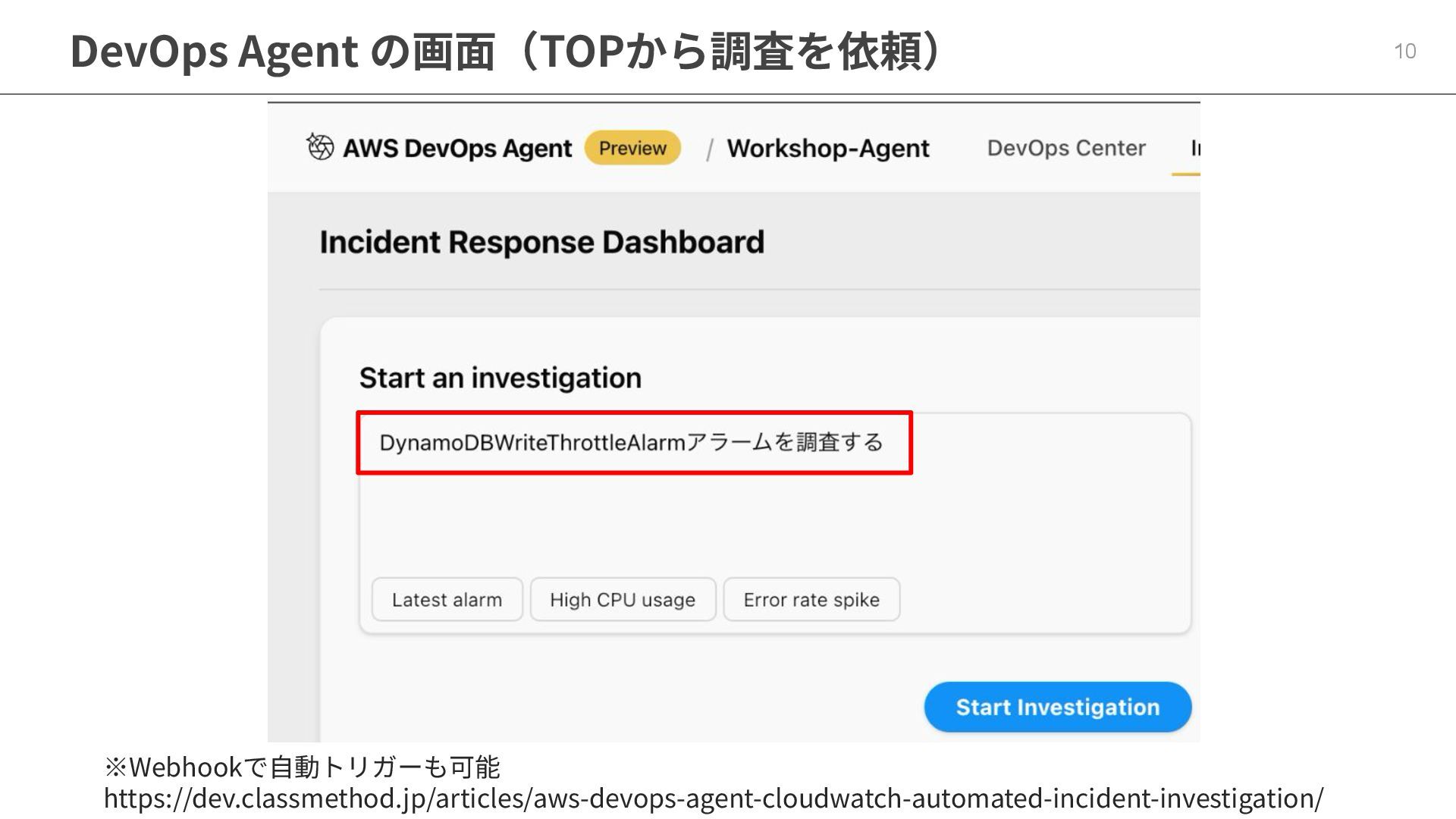 2. ⼈間かアラートやチケットをトリガーとして、⾃動でAWS環境や接続先の外部環境を 調査し、修正内容を提案、コマンドやIaCの修正も提案 具体的なフロー 1. ⼈間かアラートやチケットなどインシデントを契機にDevOps Agentが実⾏ 2. DevOps Agent が