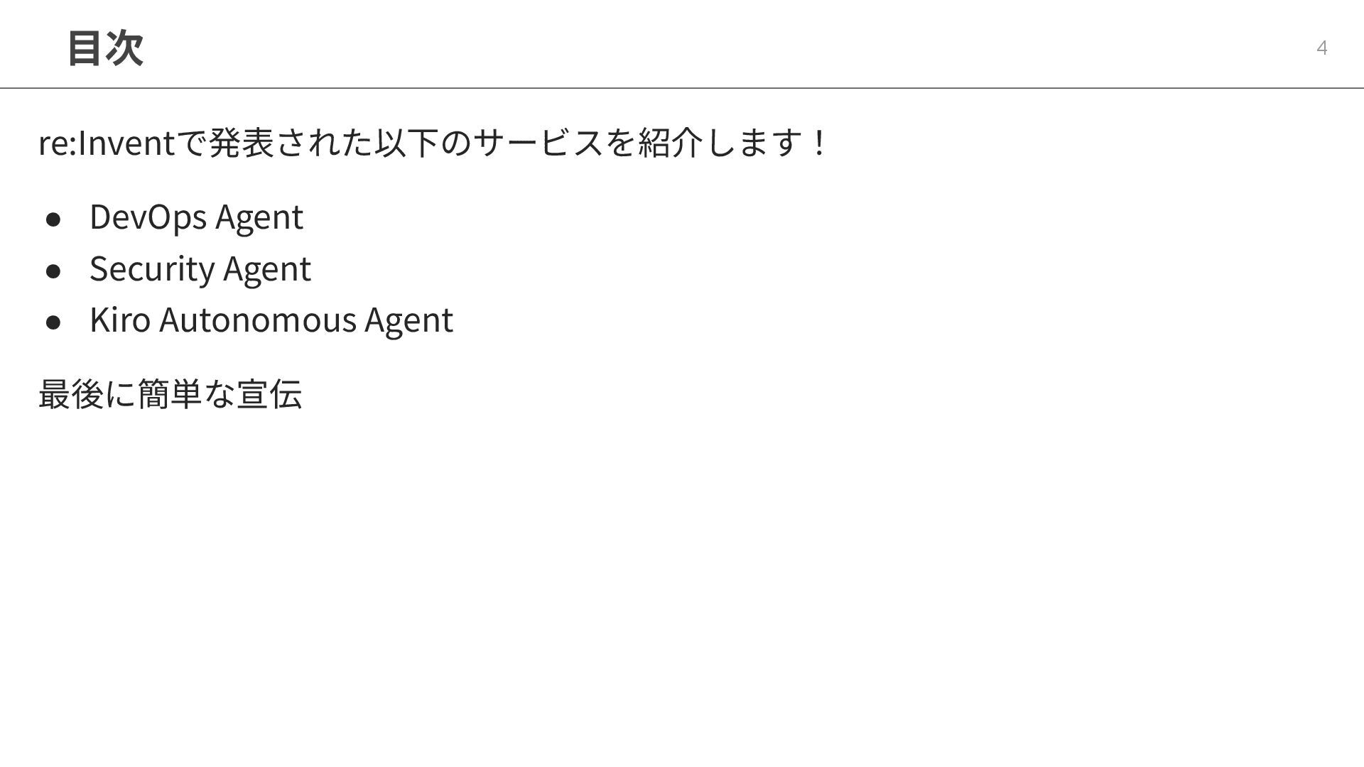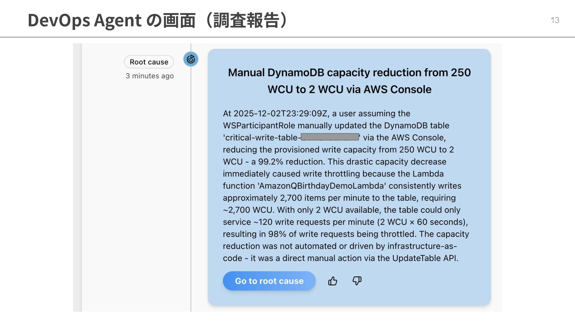 3. 利点 • インシデント発⽣時に、問題の原因特定が容易になる ◦ インシデント発⽣して、⼈間がアラートを⾒る頃には既に根本原因が特定され ているかも !? • AWSアカウントに閉じず、GitHubやMCPなど接続先を追加することで外部環境の 情報も活かしたインシデント調査が可能