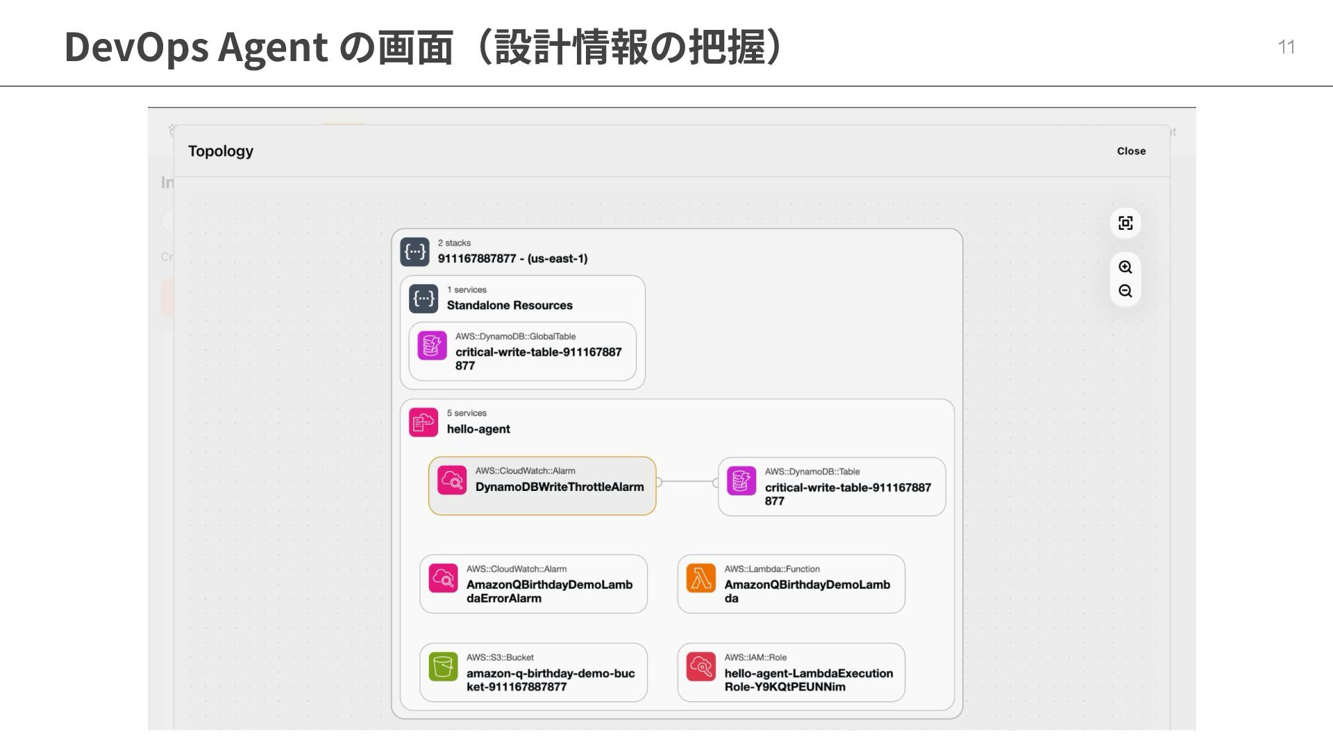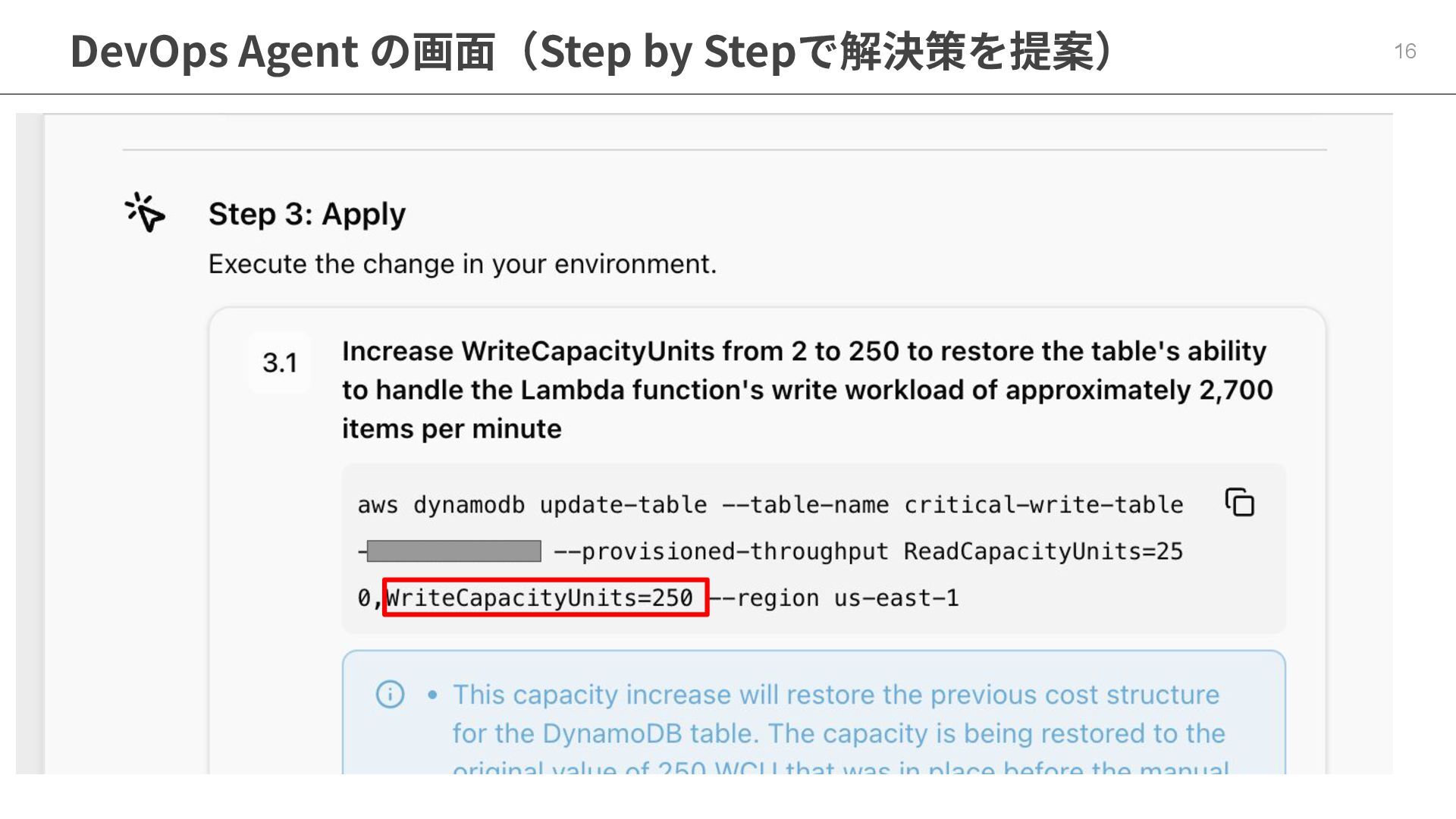 16. • Frontier Agentsの3つを紹介 ◦ DevOps Agent ▪ インシデントの⾃動調査や修正⽅法を提案 ▪ GitHubやMCPによって外部に接続して追加調査も可能
