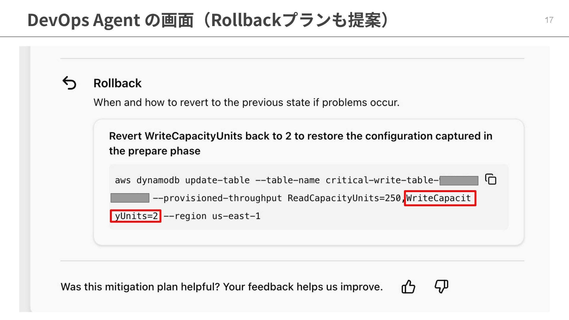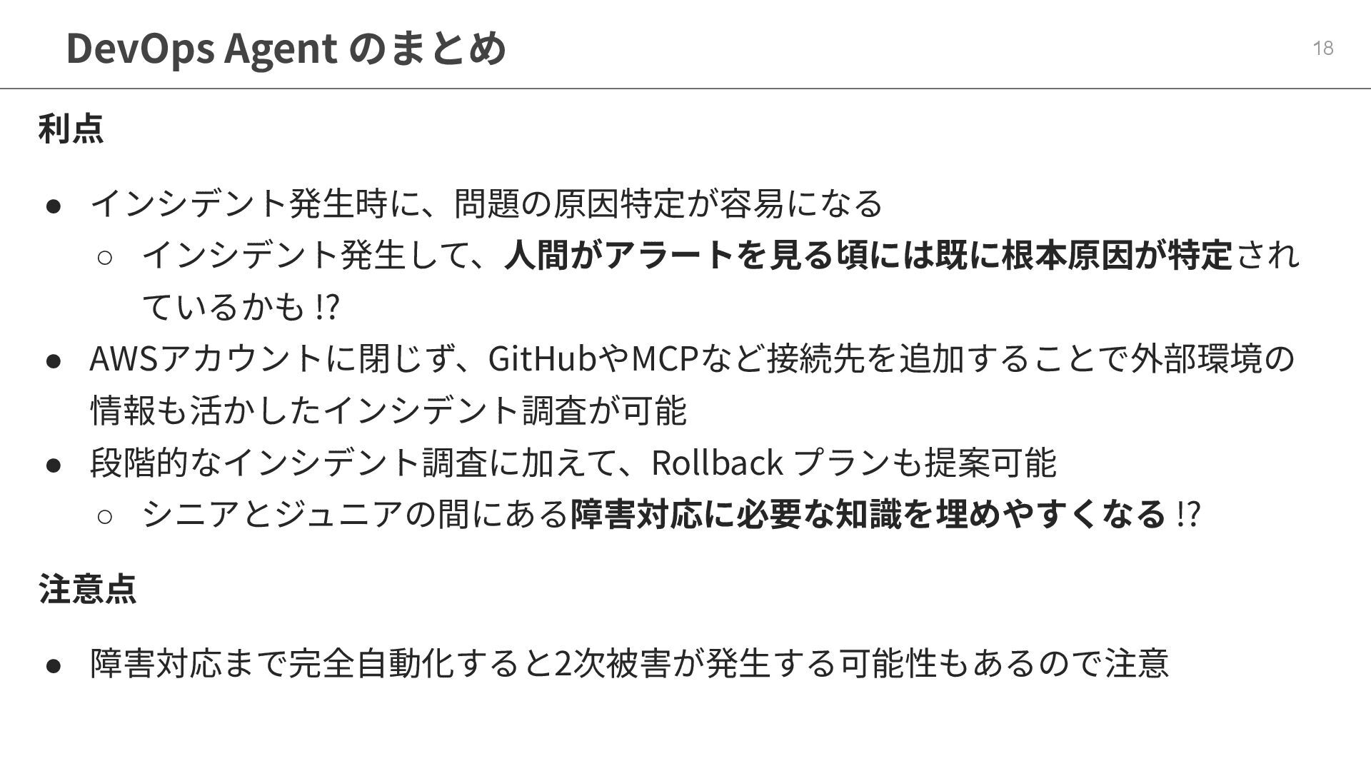 • 段階的なインシデント調査に加えて、Rollback プランも提案可能 ◦ シニアとジュニアの間にある障害対応に必要な知識を埋めやすくなる !? 注意点 • 障害対応まで完全⾃動化すると2次被害が発⽣する可能性もあるので注意 DevOps Agent のまとめ 18
