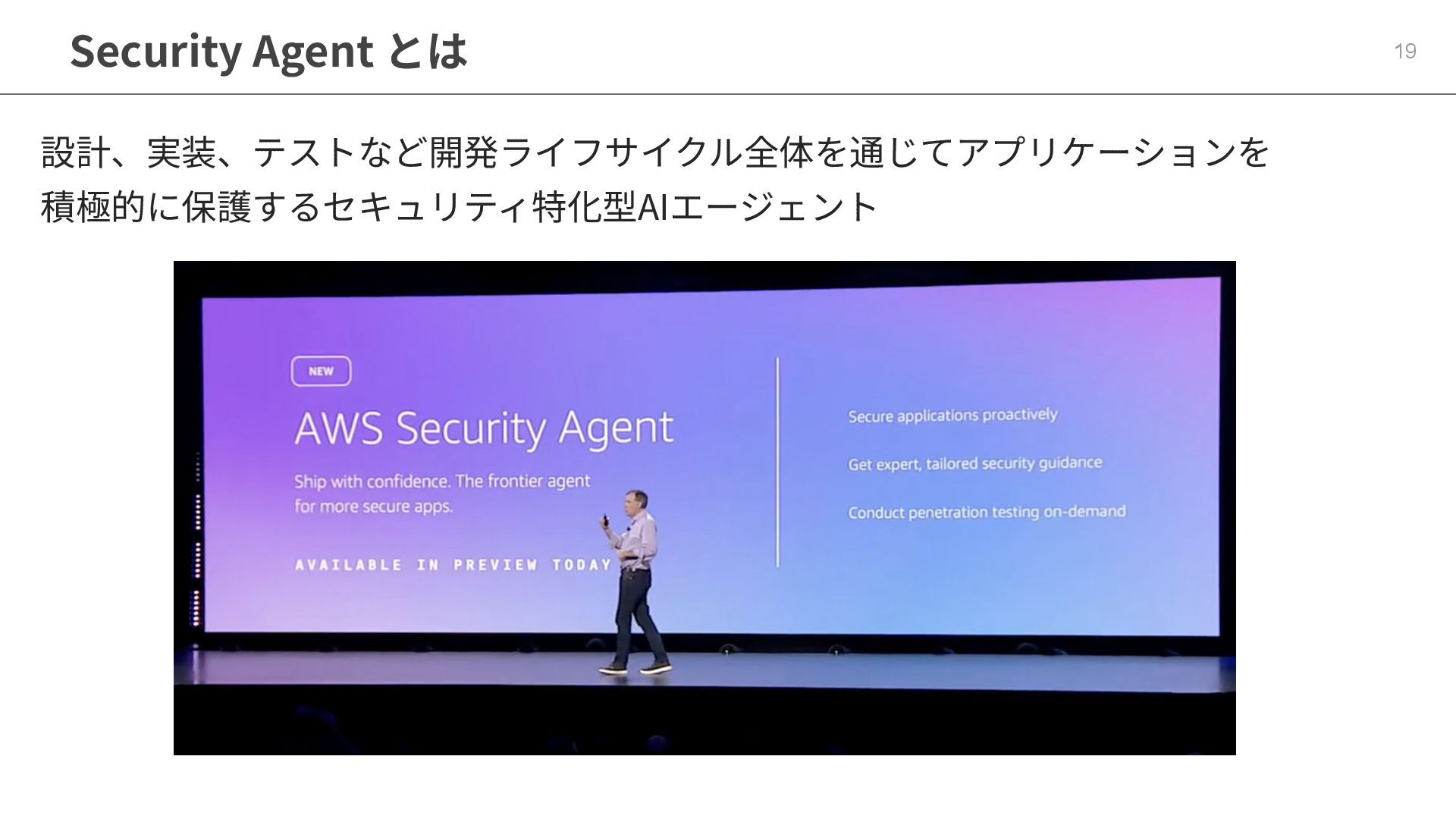 17. 現在はソフトウェアエンジニアの役割を補助するAIエージェントが複数登場してい る。これは開発者がソフトウェアエンジニアというドメインをよく理解しているの で、補助する機能がうまく実装できている • DevOps Agent:運⽤改善⽀援 • Security Agent:セキュリティ対応⽀援 •