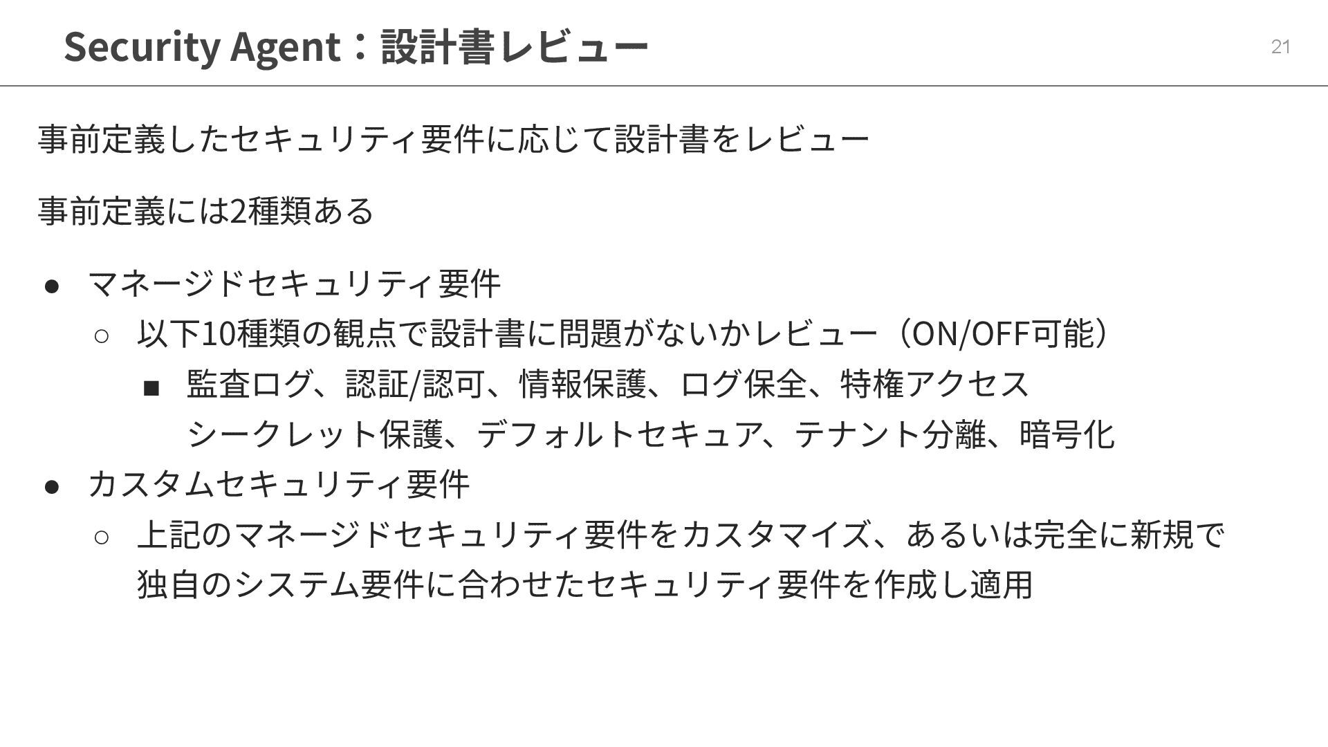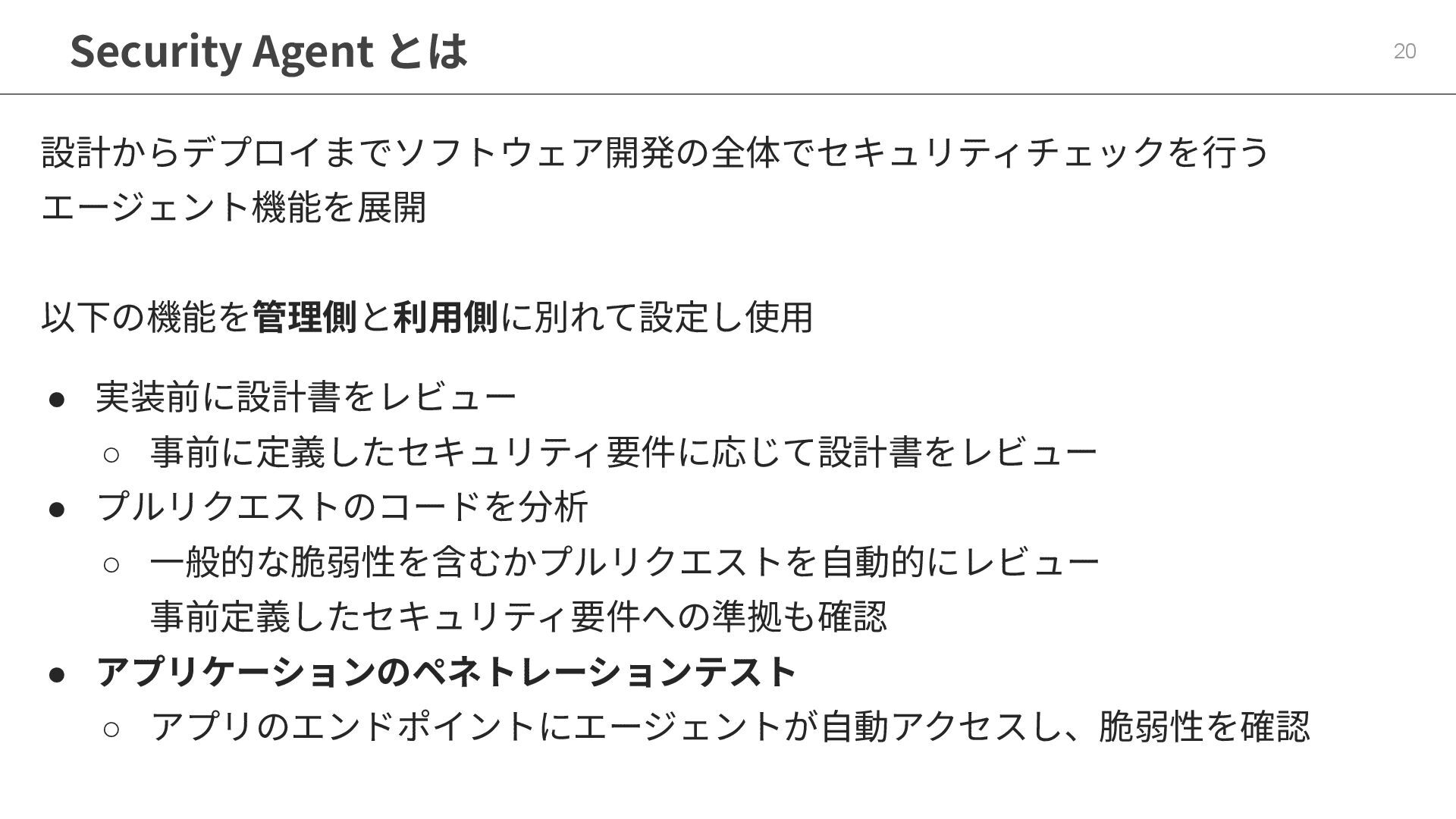 ⼀般的な脆弱性を含むかプルリクエストを⾃動的にレビュー 事前定義したセキュリティ要件への準拠も確認 • アプリケーションのペネトレーションテスト ◦ アプリのエンドポイントにエージェントが⾃動アクセスし、脆弱性を確認 Security Agent とは 20