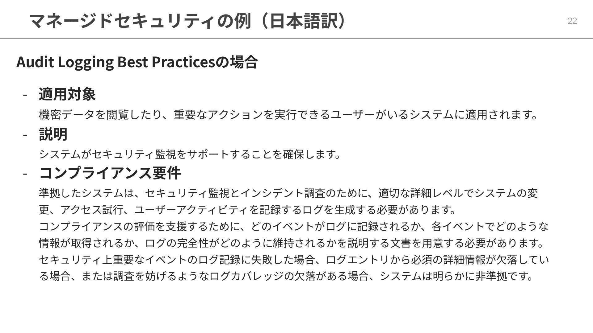 - コンプライアンス要件 準拠したシステムは、セキュリティ監視とインシデント調査のために、適切な詳細レベルでシステムの変 更、アクセス試⾏、ユーザーアクティビティを記録するログを⽣成する必要があります。 コンプライアンスの評価を⽀援するために、どのイベントがログに記録されるか、各イベントでどのような 情報が取得されるか、ログの完全性がどのように維持されるかを説明する⽂書を⽤意する必要があります。 セキュリティ上重要なイベントのログ記録に失敗した場合、ログエントリから必須の詳細情報が⽋落してい る場合、または調査を妨げるようなログカバレッジの⽋落がある場合、システムは明らかに⾮準拠です。 マネージドセキュリティの例(⽇本語訳) 22