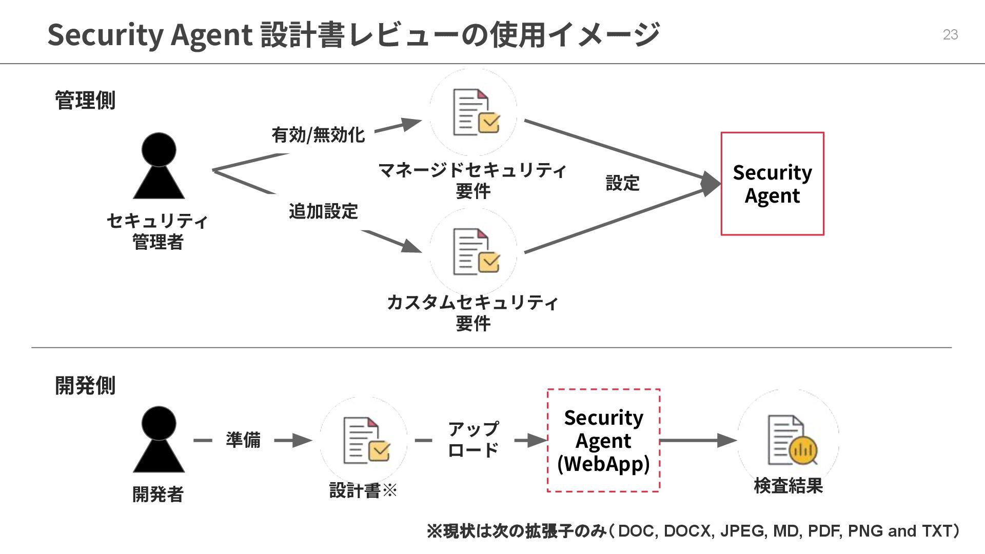 6. Security Agent 設計書レビューの使⽤イメージ 23 ※現状は次の拡張子のみ( DOC, DOCX, JPEG, MD, PDF,