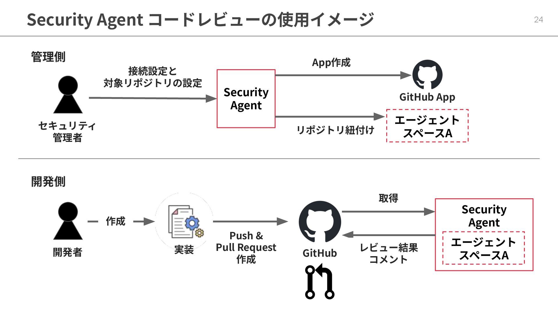 管理者 実装 接続設定と 対象リポジトリの設定 管理側 開発側 開発者 作成 Push & Pull Request 作成 GitHub App App作成 GitHub Security Agent レビュー結果 コメント リポジトリ紐付け エージェント スペースA