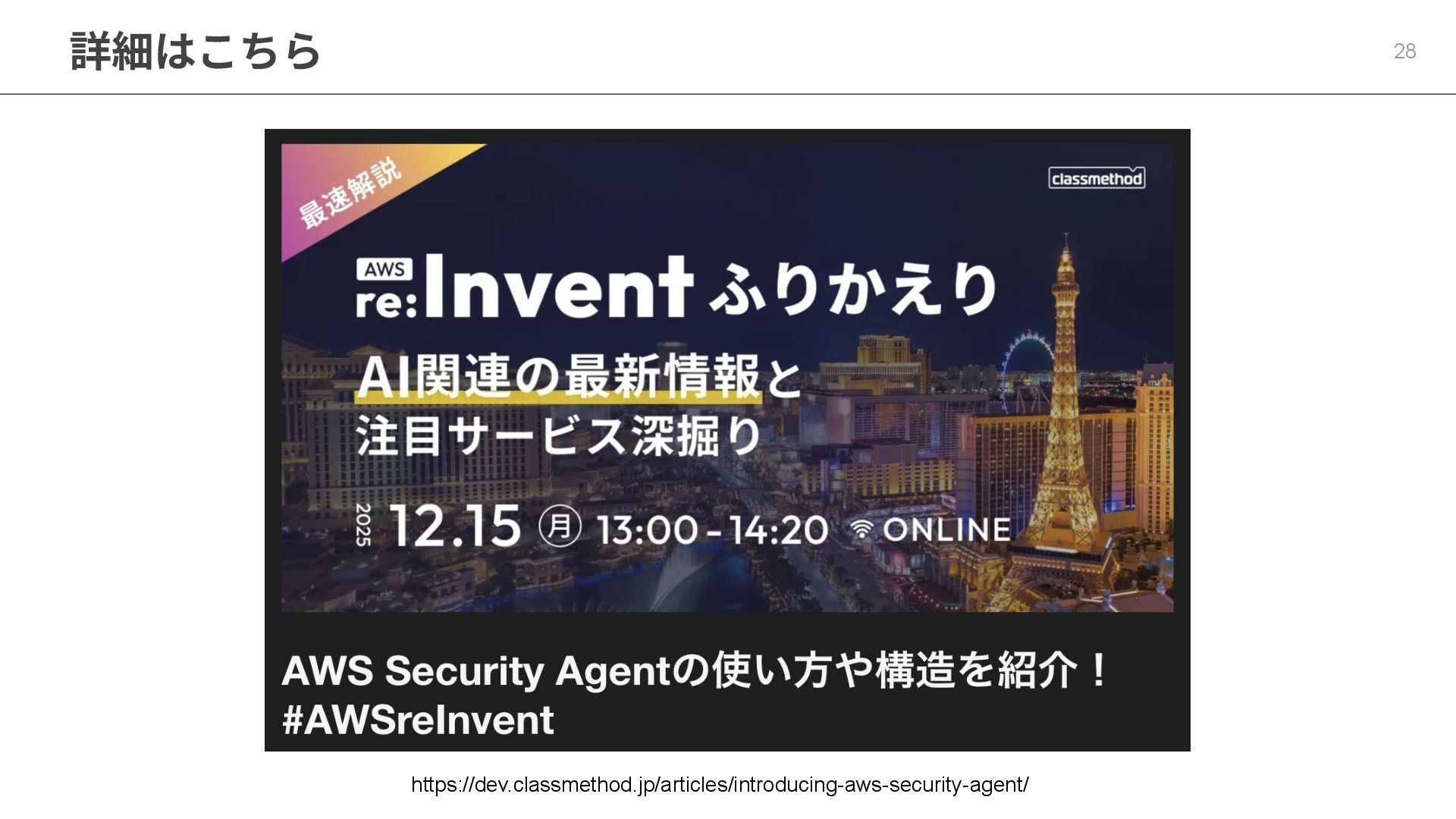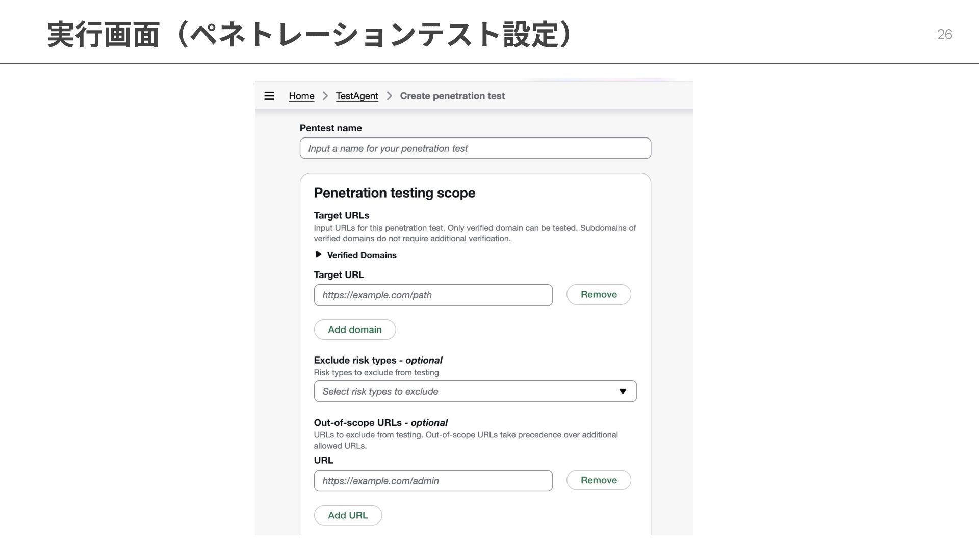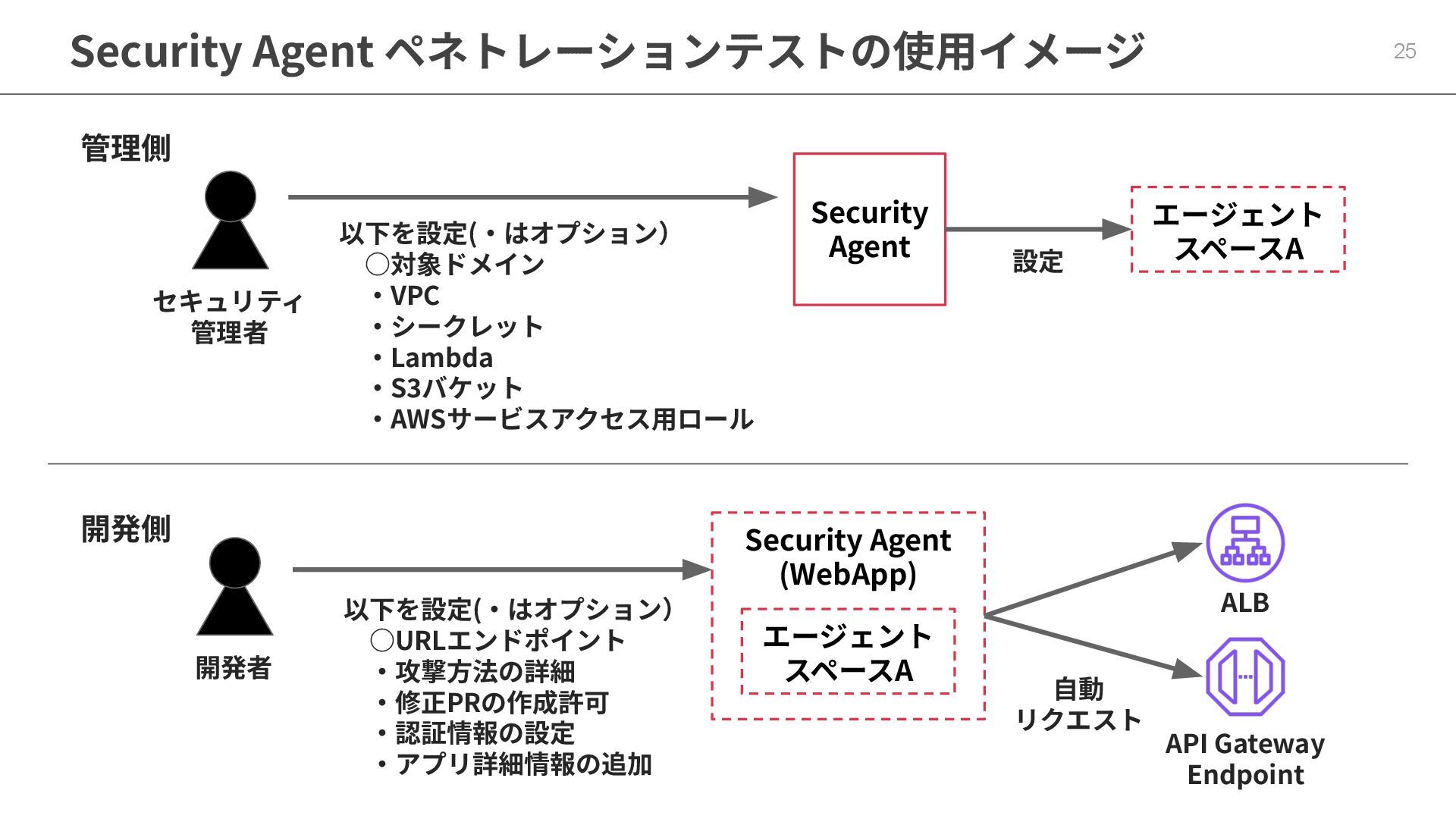 ‧Lambda  ‧S3バケット  ‧AWSサービスアクセス⽤ロール Security Agent ペネトレーションテストの使⽤イメージ 25 Security Agent セキュリティ 管理者 管理側 開発側 開発者 Security Agent (WebApp) ALB API Gateway Endpoint ⾃動 リクエスト エージェント スペースA 設定 エージェント スペースA
