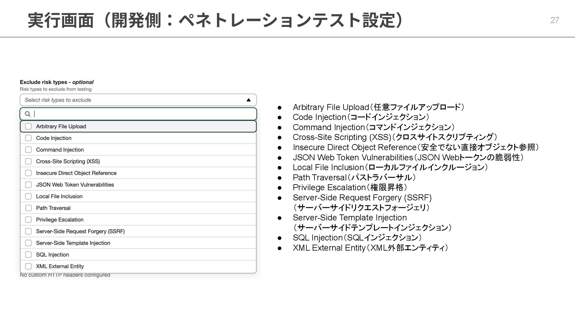 • Cross-Site Scripting (XSS)(クロスサイトスクリプティング) • Insecure Direct Object Reference(安全でない直接オブジェクト参照) • JSON Web Token Vulnerabilities(JSON Webトークンの脆弱性) • Local File Inclusion(ローカルファイルインクルージョン) • Path Traversal(パストラバーサル) • Privilege Escalation(権限昇格) • Server-Side Request Forgery (SSRF) (サーバーサイドリクエストフォージェリ) • Server-Side Template Injection (サーバーサイドテンプレートインジェクション) • SQL Injection(SQLインジェクション) • XML External Entity(XML外部エンティティ) 実⾏画⾯(開発側:ペネトレーションテスト設定) 27
