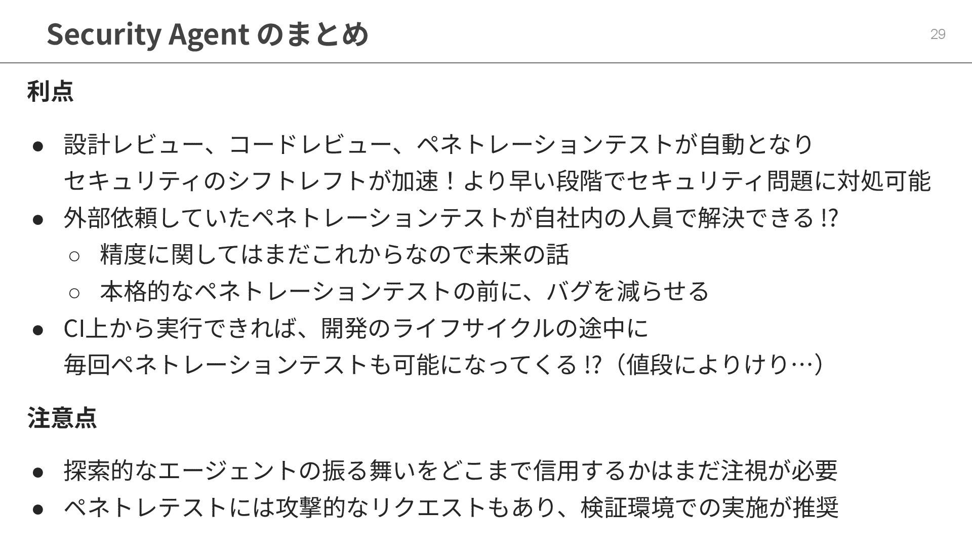 本格的なペネトレーションテストの前に、バグを減らせる • CI上から実⾏できれば、開発のライフサイクルの途中に 毎回ペネトレーションテストも可能になってくる !?(値段によりけり…) 注意点 • 探索的なエージェントの振る舞いをどこまで信⽤するかはまだ注視が必要 • ペネトレテストには攻撃的なリクエストもあり、検証環境での実施が推奨 Security Agent のまとめ 29