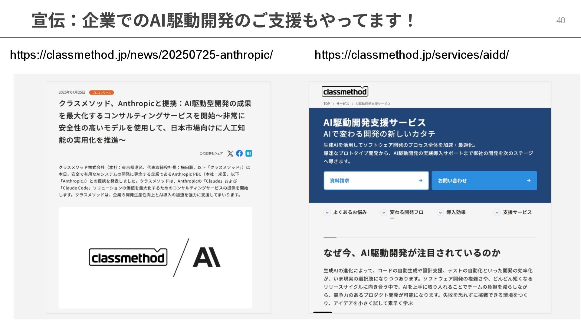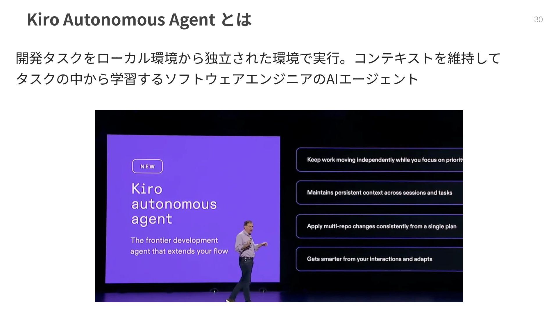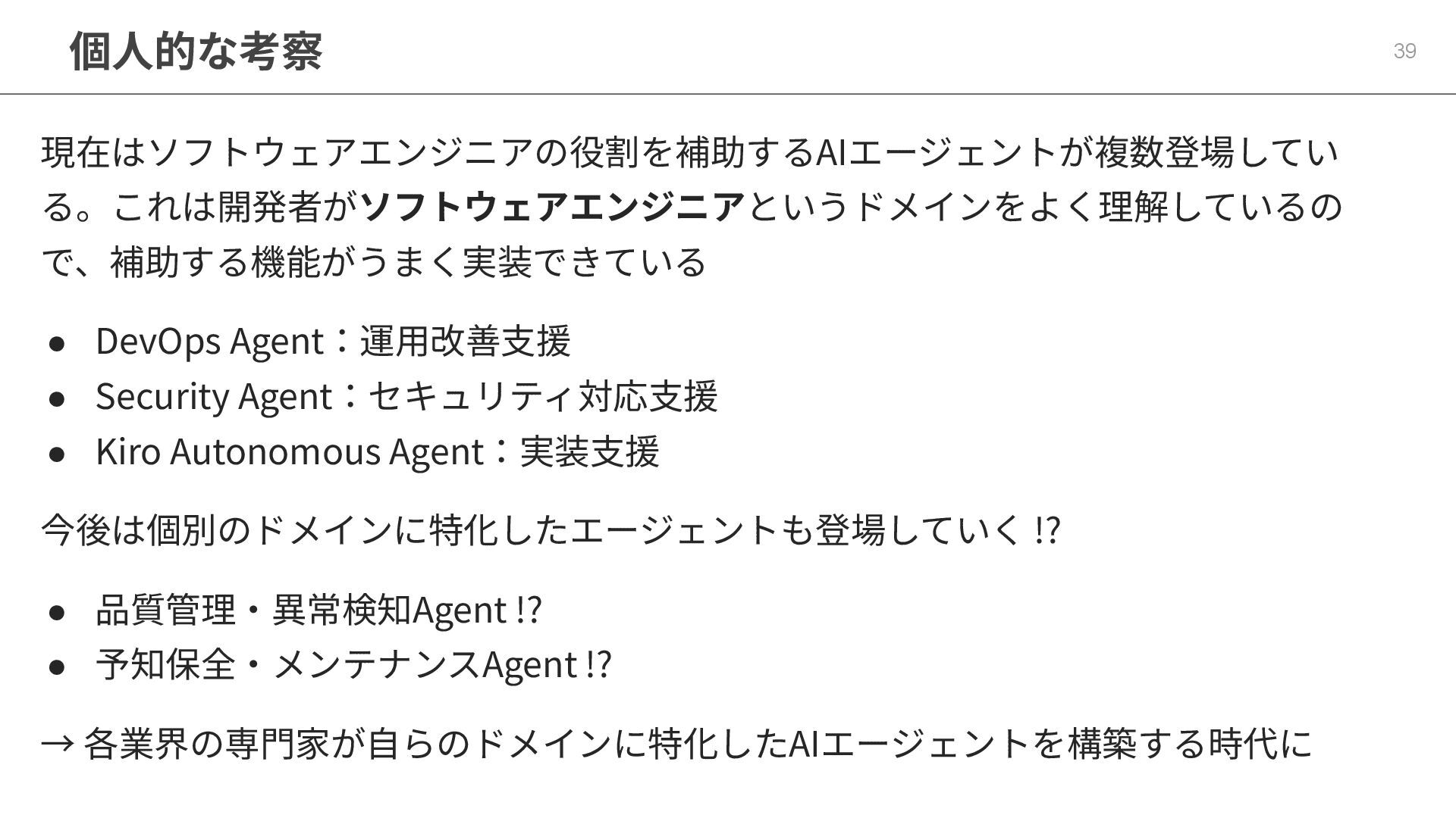 Kiro Autonomous Agent:実装⽀援 今後は個別のドメインに特化したエージェントも登場していく !? • 品質管理‧異常検知Agent !? • 予知保全‧メンテナンスAgent !? → 各業界の専⾨家が⾃らのドメインに特化したAIエージェントを構築する時代に 個⼈的な考察 39