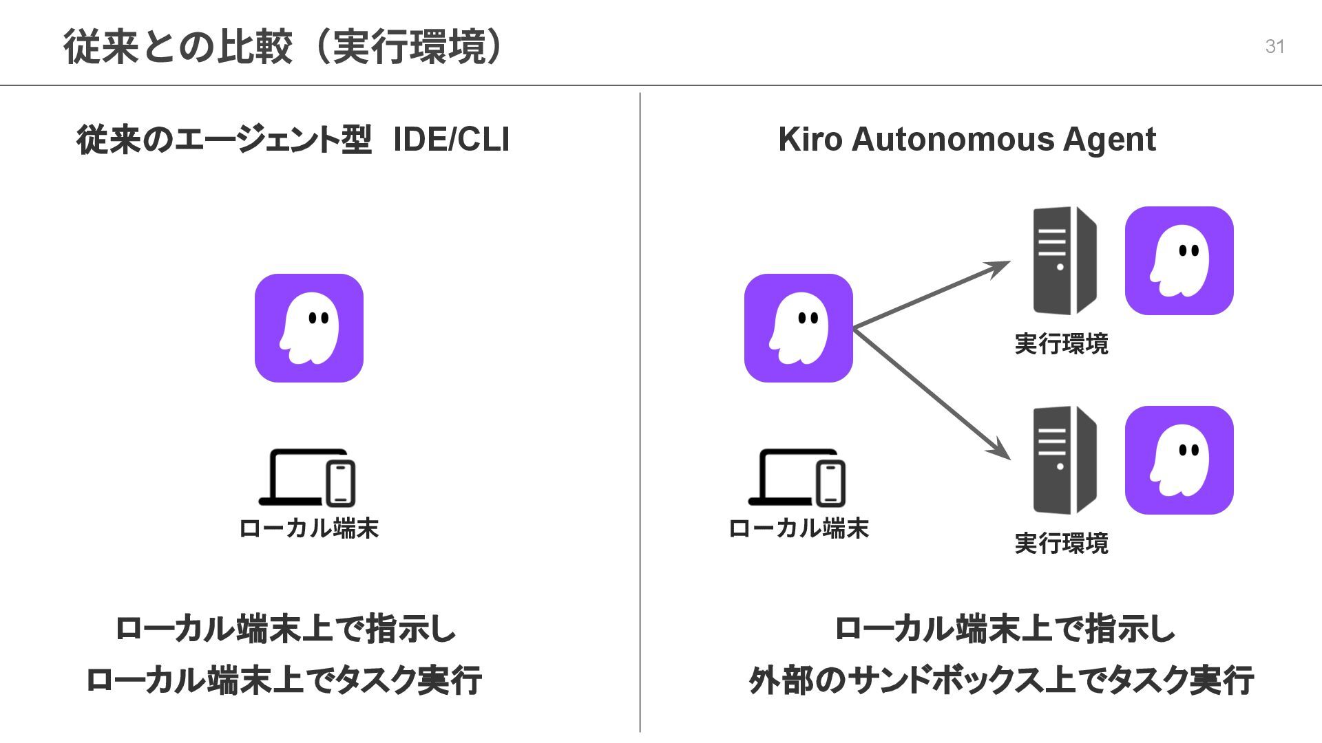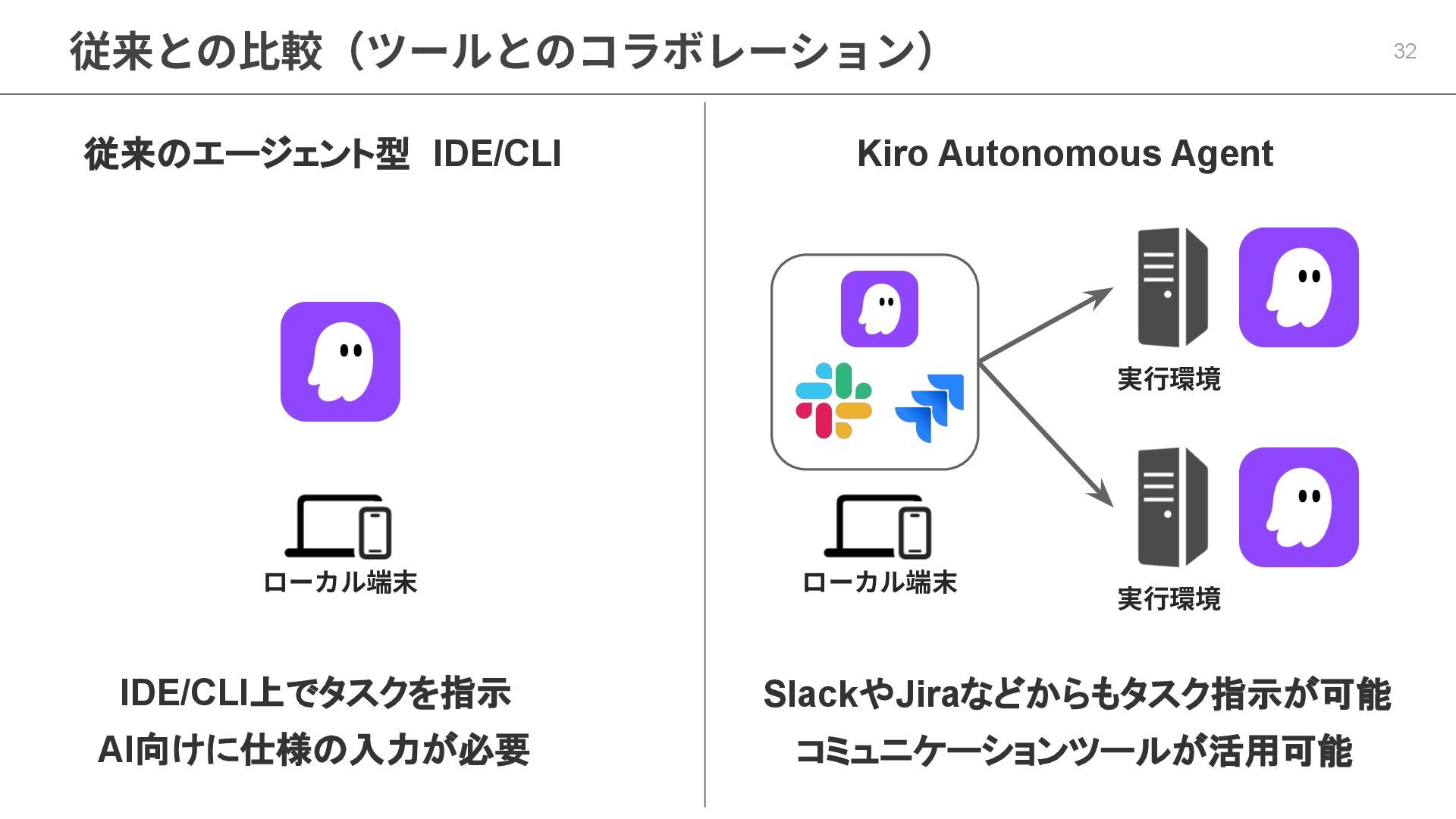 11. 従来との⽐較(実⾏環境) 31 従来のエージェント型 IDE/CLI Kiro Autonomous Agent ローカル端末 ローカル端末上で指示し ローカル端末上でタスク実行