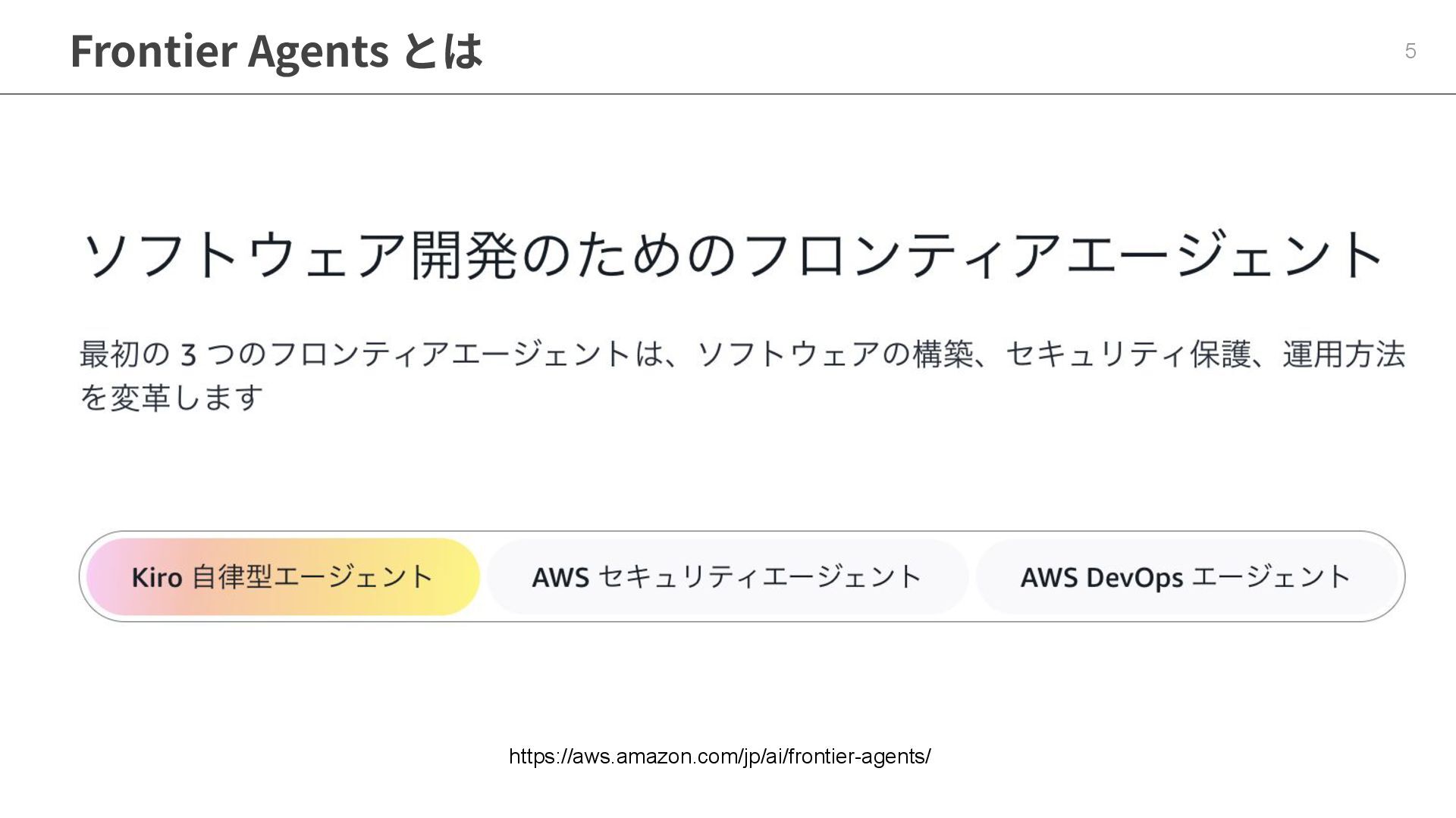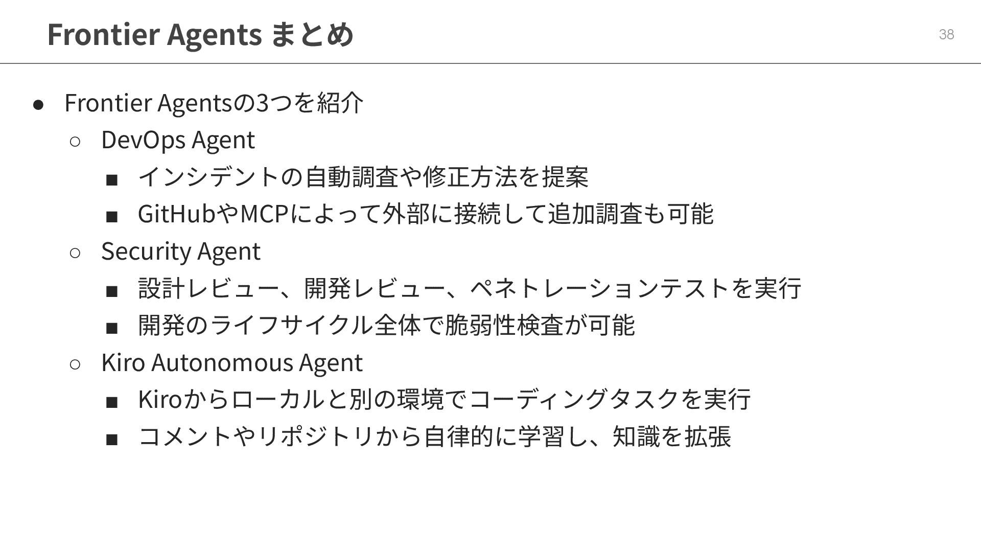 ◦ Security Agent ▪ 設計レビュー、開発レビュー、ペネトレーションテストを実⾏ ▪ 開発のライフサイクル全体で脆弱性検査が可能 ◦ Kiro Autonomous Agent ▪ Kiroからローカルと別の環境でコーディングタスクを実⾏ ▪ コメントやリポジトリから⾃律的に学習し、知識を拡張 Frontier Agents まとめ 38