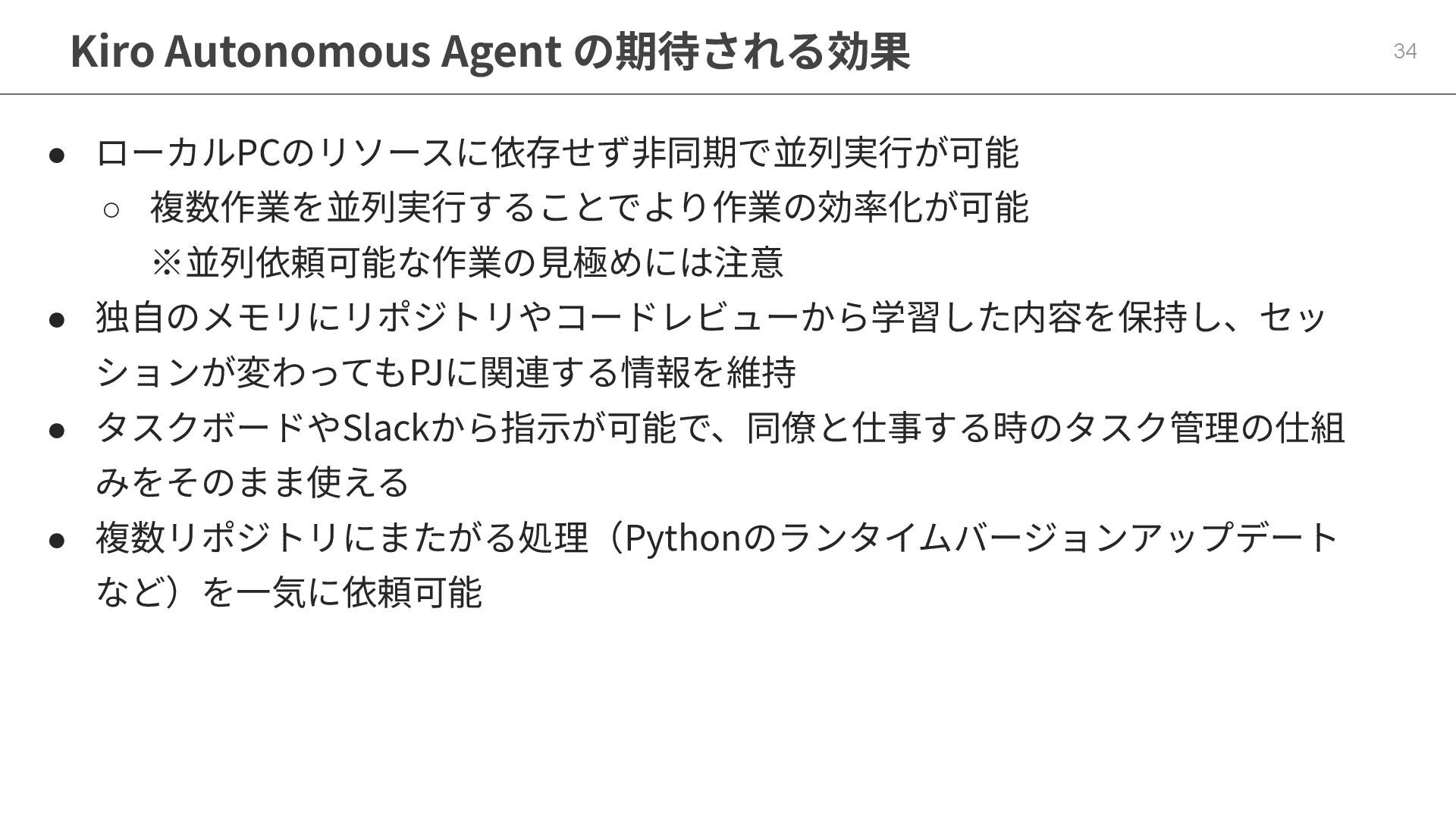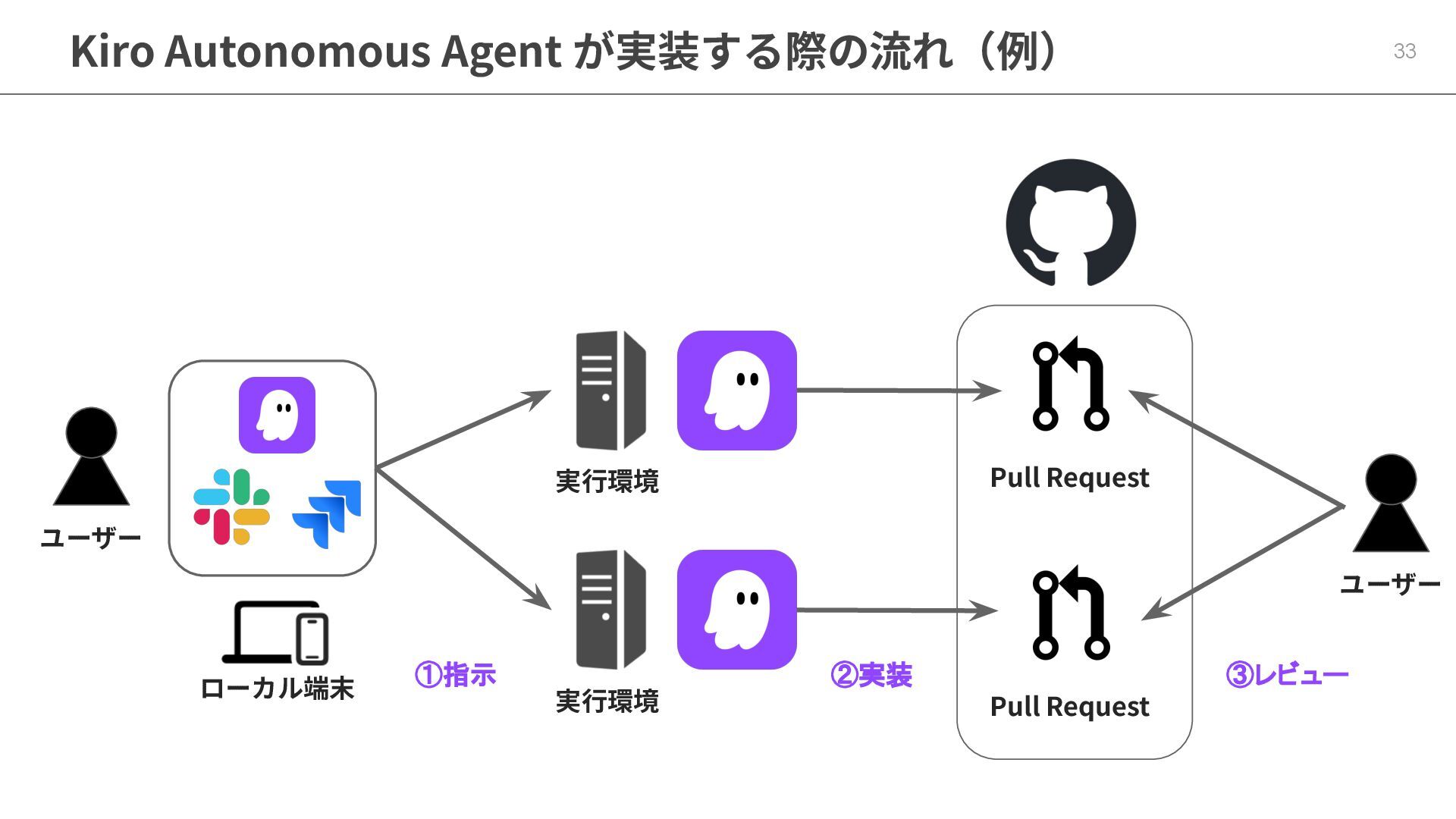 12. 従来との⽐較(ツールとのコラボレーション) 32 従来のエージェント型 IDE/CLI Kiro Autonomous Agent ローカル端末 IDE/CLI上でタスクを指示 AI向けに仕様の入力が必要