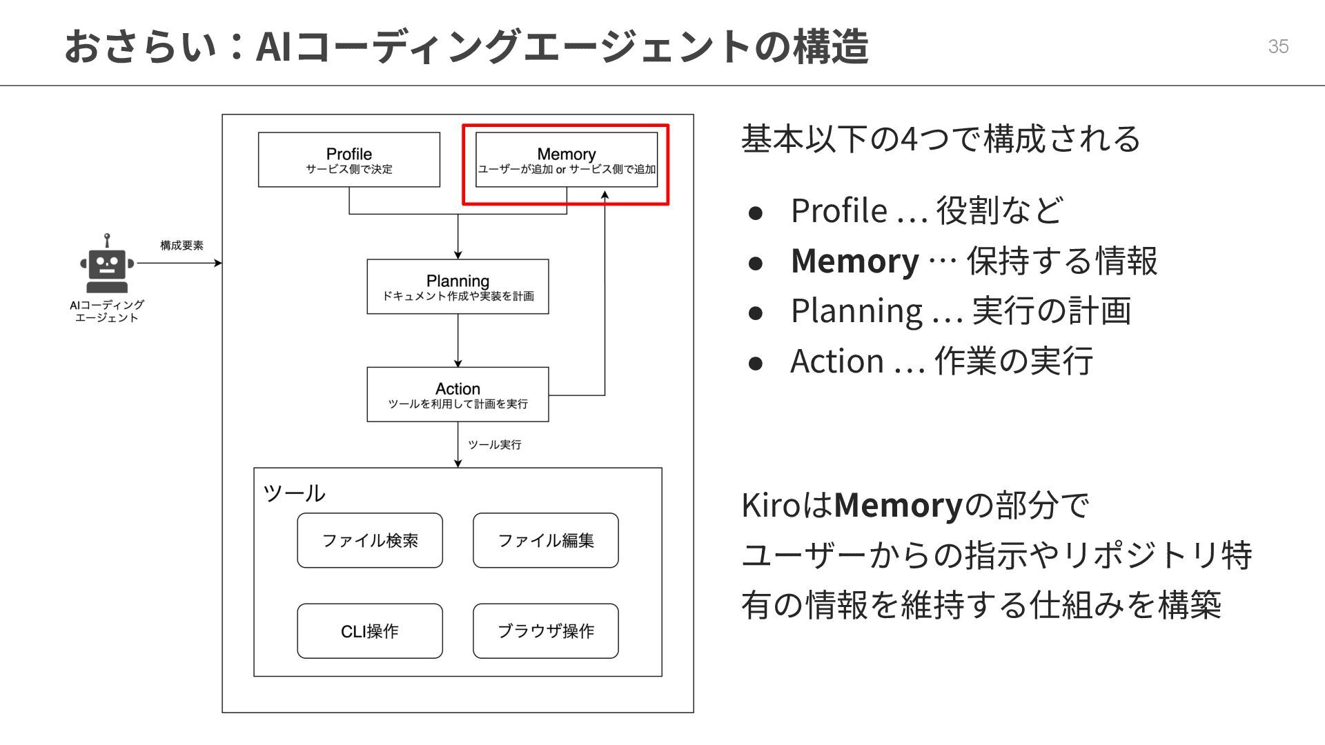 保持する情報 • Planning … 実⾏の計画 • Action … 作業の実⾏ KiroはMemoryの部分で ユーザーからの指⽰やリポジトリ特 有の情報を維持する仕組みを構築