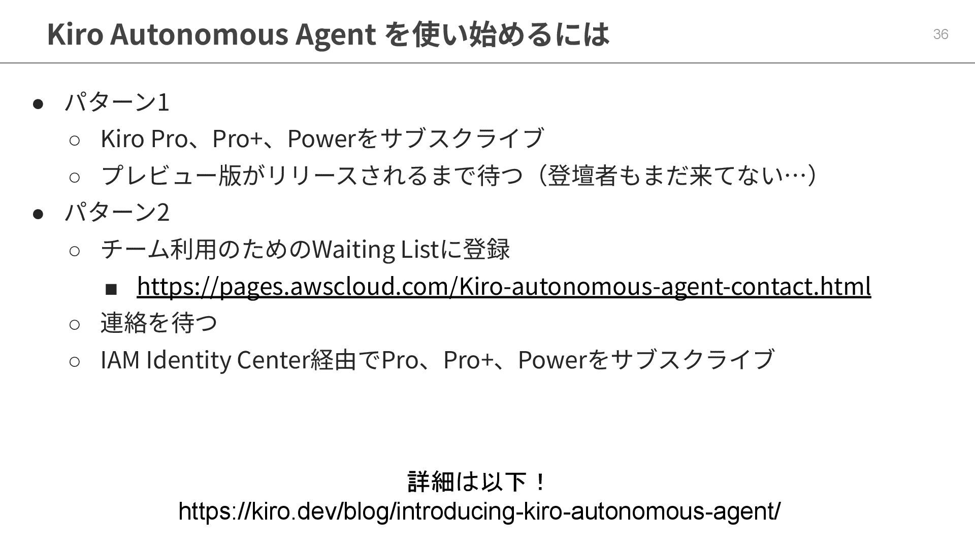 チーム利⽤のためのWaiting Listに登録 ▪ https://pages.awscloud.com/Kiro-autonomous-agent-contact.html ◦ 連絡を待つ ◦ IAM Identity Center経由でPro、Pro+、Powerをサブスクライブ Kiro Autonomous Agent を使い始めるには 36 詳細は以下! https://kiro.dev/blog/introducing-kiro-autonomous-agent/