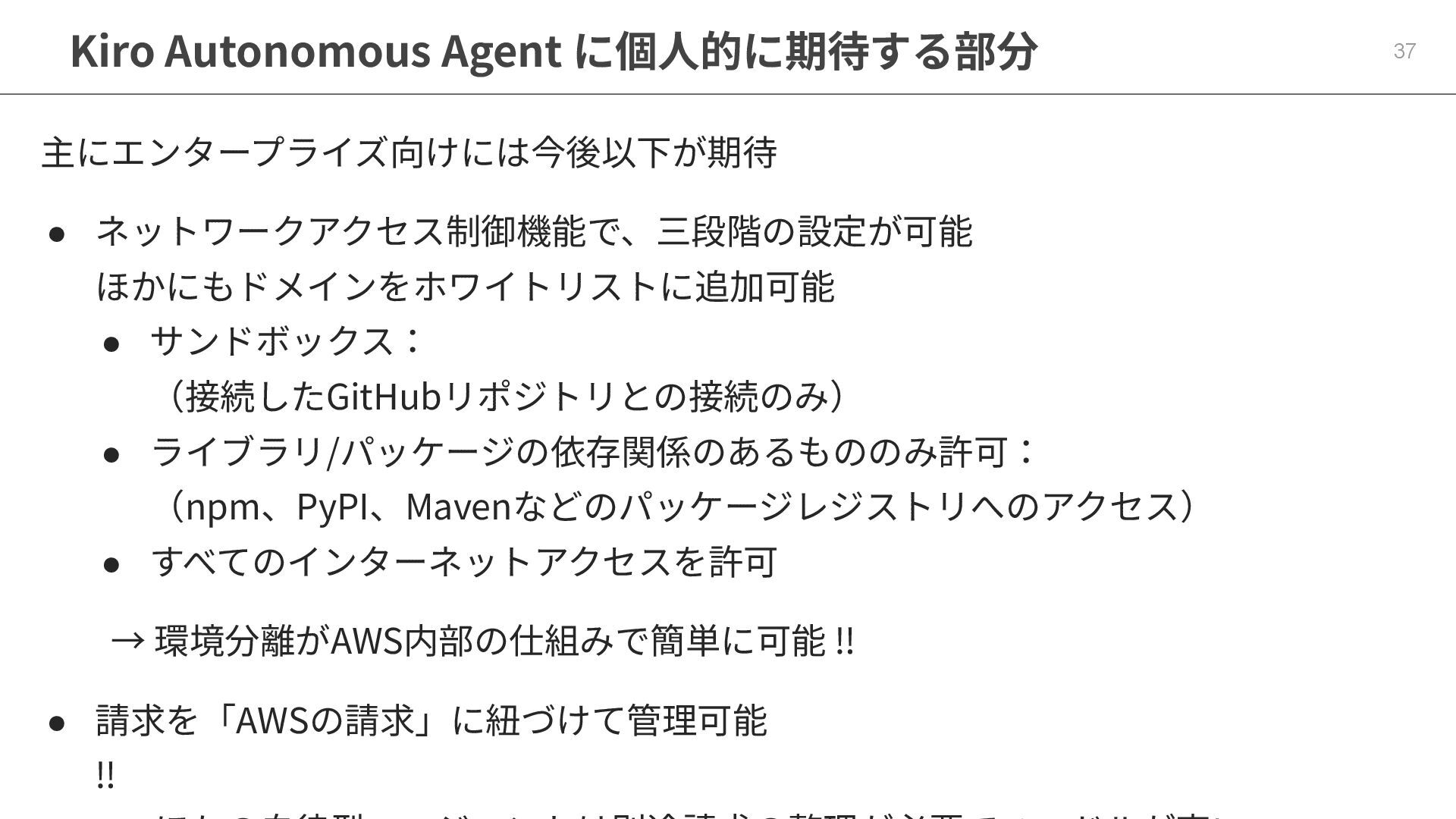 15. Kiro Autonomous Agent に個⼈的に期待する部分 主にエンタープライズ向けには今後以下が期待 • ネットワークアクセス制御機能で、三段階の設定が可能 ほかにもドメインをホワイトリストに追加可能 • サンドボックス: