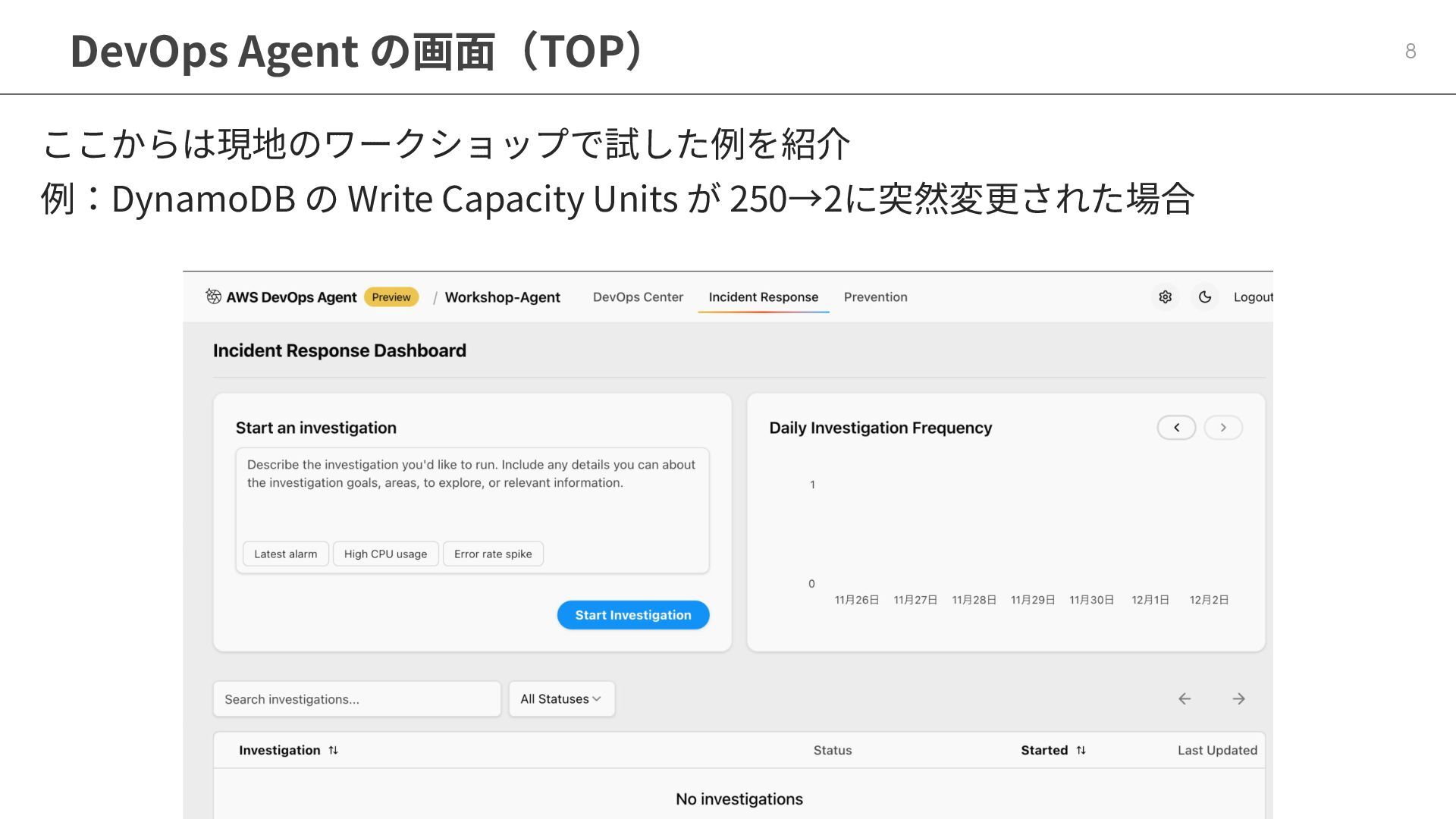 AWS環境を調査 GitHubやMCPを繋ぐことで外部の変更(IaCなど)も調査可能 3. 調査結果からインシデントの原因を報告 4. インシデントへの対応策を提案 基本はCLIベースでの修正、ほかにIaCの修正も提案可能※ DevOps Agent の具体的な機能 7 ※https://dev.classmethod.jp/articles/awsreinvent-devops-agent-cdk-miss-config/