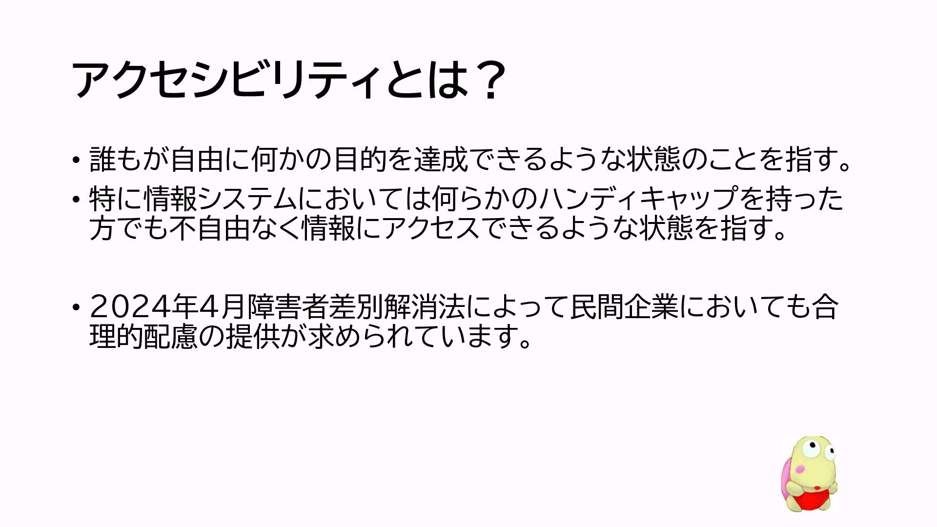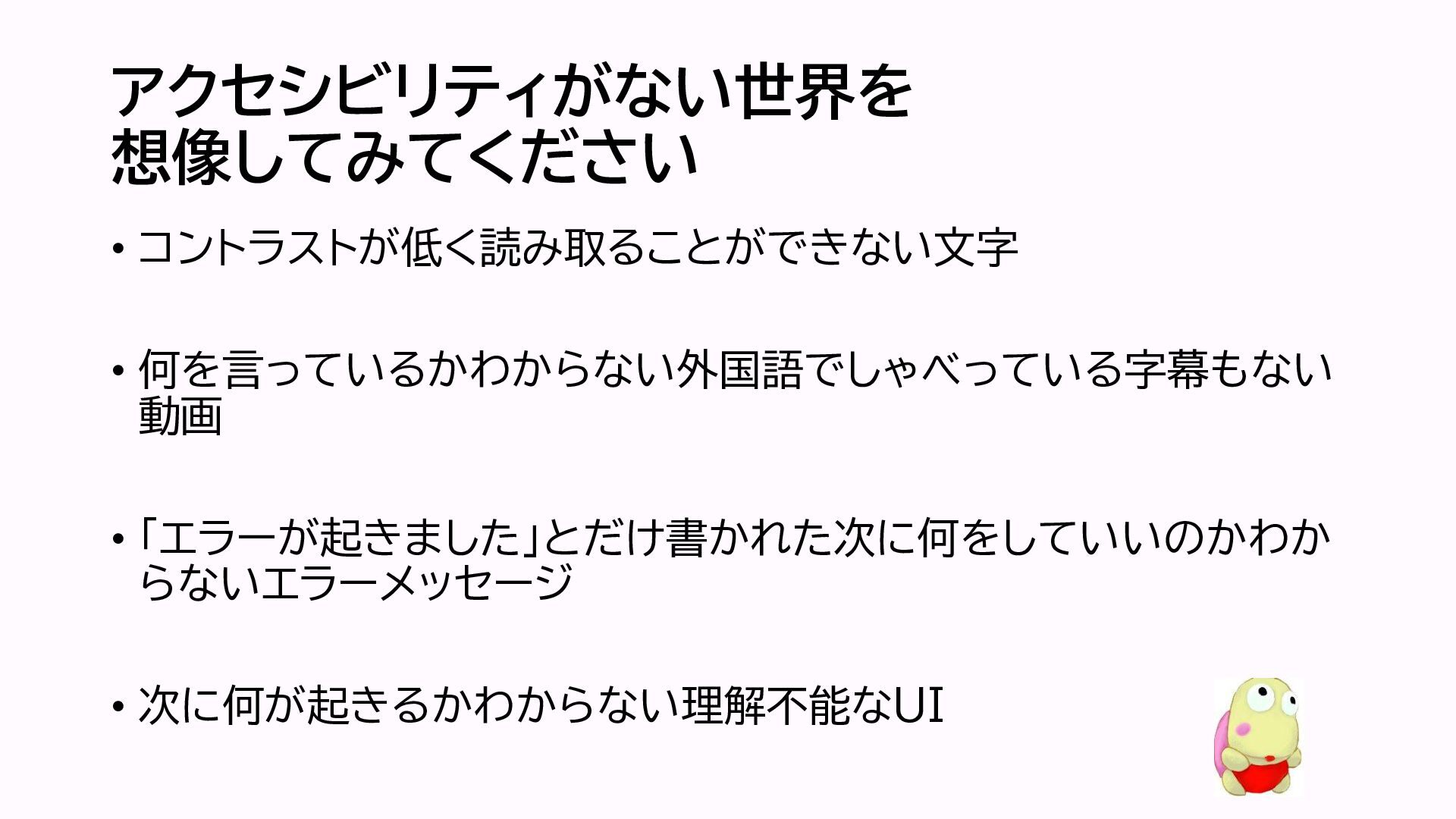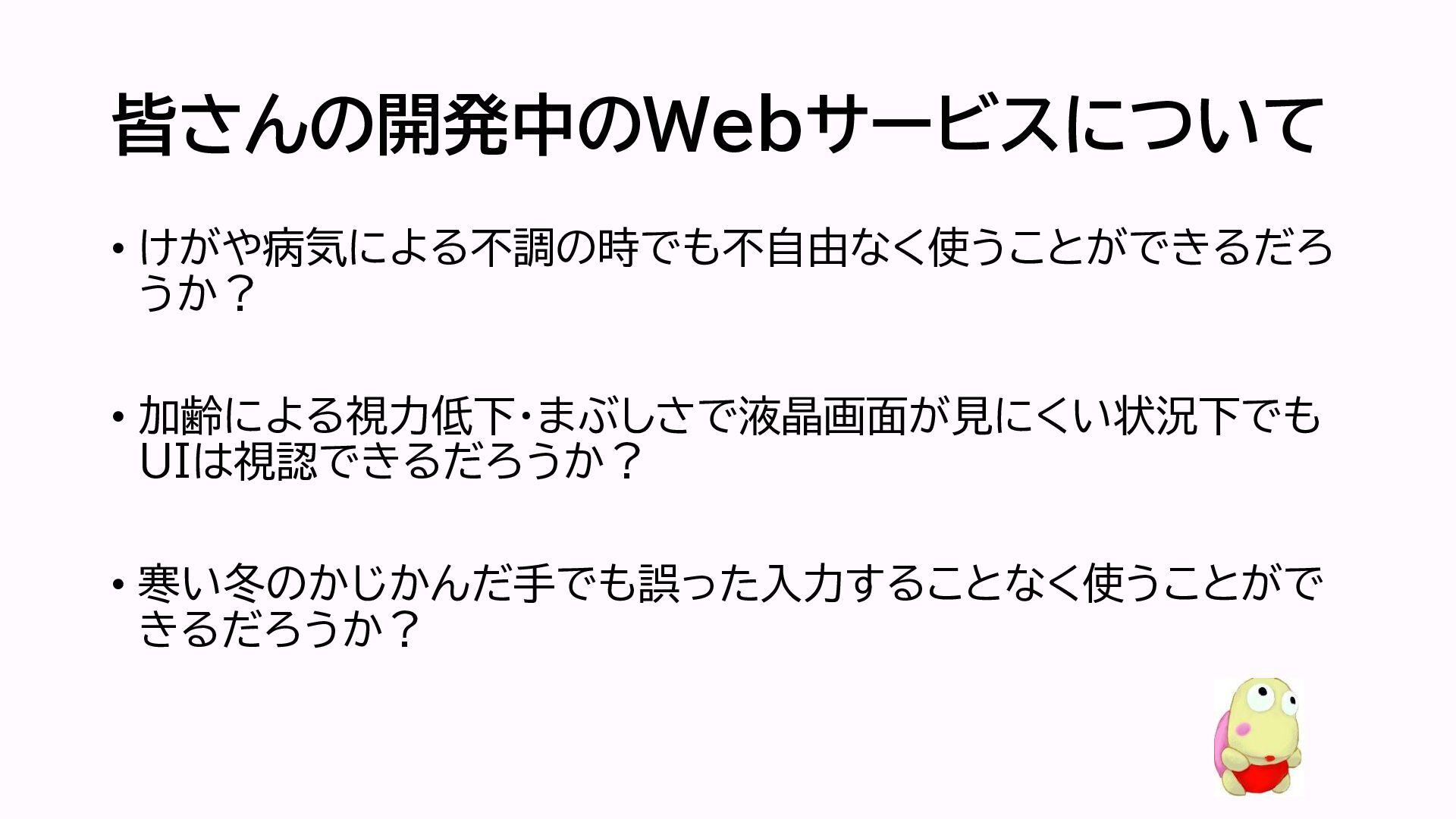 2. アクセシビリティの根幹 • 情報や機能への「別ルート」を確保するということ • 視覚に頼れないとき →スクリーンリーダー • 聴覚に頼れないとき →字幕・文字情報 •