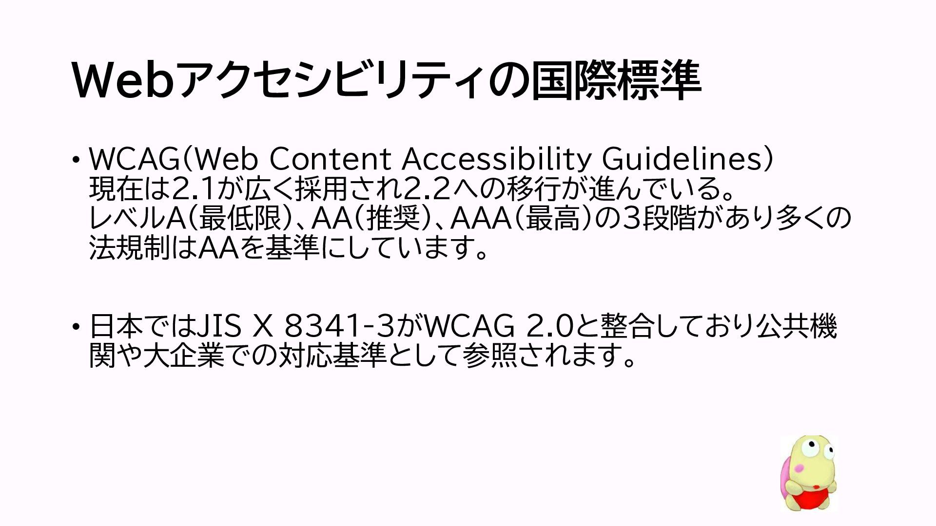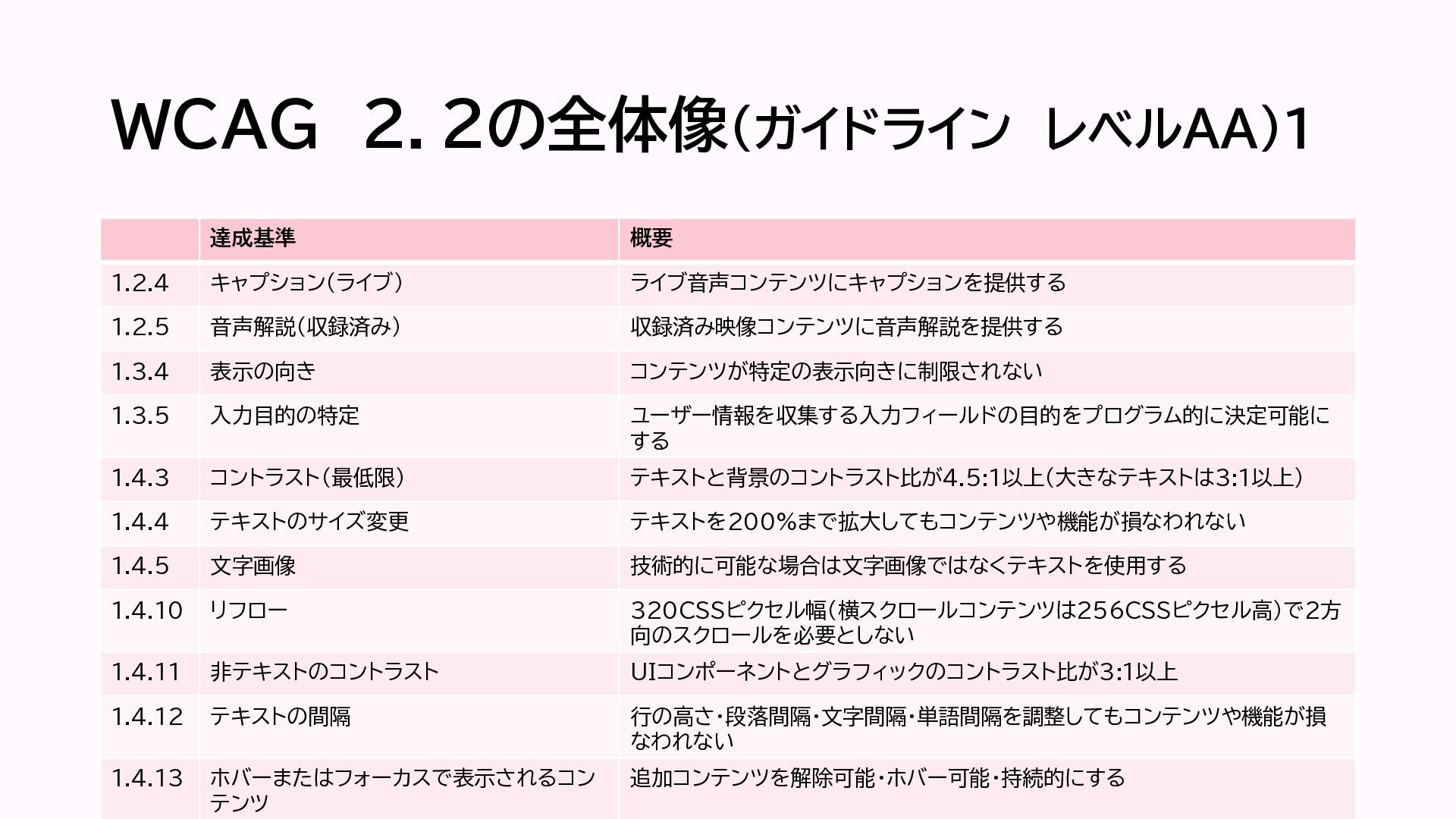 収録済み映像コンテンツに音声解説を提供する 1.3.4 表示の向き コンテンツが特定の表示向きに制限されない 1.3.5 入力目的の特定 ユーザー情報を収集する入力フィールドの目的をプログラム的に決定可能に する 1.4.3 コントラスト(最低限) テキストと背景のコントラスト比が4.5:1以上(大きなテキストは3:1以上) 1.4.4 テキストのサイズ変更 テキストを200%まで拡大してもコンテンツや機能が損なわれない 1.4.5 文字画像 技術的に可能な場合は文字画像ではなくテキストを使用する 1.4.10 リフロー 320CSSピクセル幅(横スクロールコンテンツは256CSSピクセル高)で2方 向のスクロールを必要としない 1.4.11 非テキストのコントラスト UIコンポーネントとグラフィックのコントラスト比が3:1以上 1.4.12 テキストの間隔 行の高さ・段落間隔・文字間隔・単語間隔を調整してもコンテンツや機能が損 なわれない 1.4.13 ホバーまたはフォーカスで表示されるコン テンツ 追加コンテンツを解除可能・ホバー可能・持続的にする