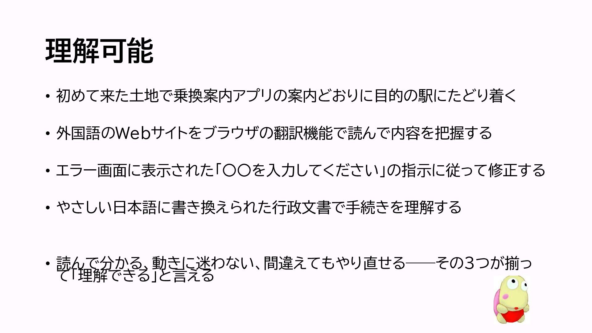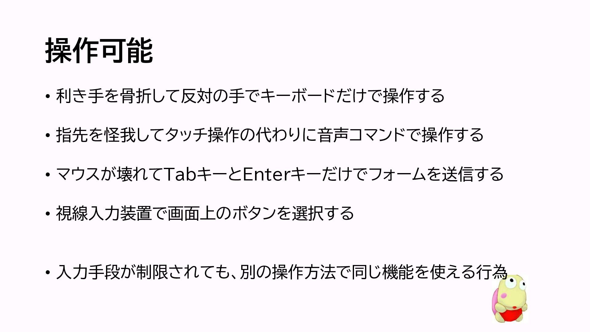 操作可能 UIコンポーネントとナビゲーションが操作可能でなければならないという原則です。キー ボードのみでの操作や、十分な操作時間の確保、発作を引き起こさないコンテンツ設計な どが含まれます。 理解可能 情報とUIの操作が理解可能でなければならないという原則です。読みやすいテキスト、予 測可能なページ動作、入力を支援する機能などが該当します。 堅牢 コンテンツが支援技術を含む多様なユーザーエージェントによって確実に解釈できるほど 堅牢でなければならないという原則です。