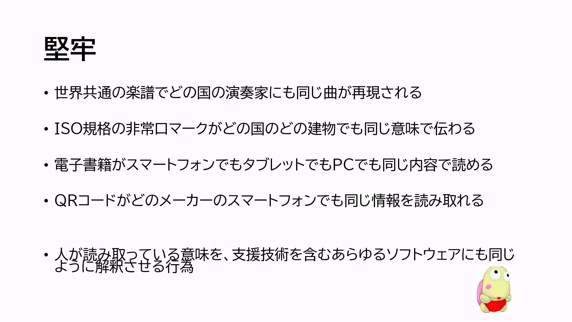 1.2.1 音声のみ・映像のみ(収録済み) 不可能 必須 1.2.2 キャプション(収録済み) 限定的 必須 1.2.3 音声解説またはメディアの代替(収録済み) 不可能 必須 1.3.1 情報および関係性 部分的に可能 必須 1.3.2 意味のある順序 限定的 必須 1.3.3 感覚的な特徴 不可能 必須 1.4.1 色の使用 限定的 必須 1.4.2 音声の制御 限定的 必須 2.1.1 キーボード 限定的 必須