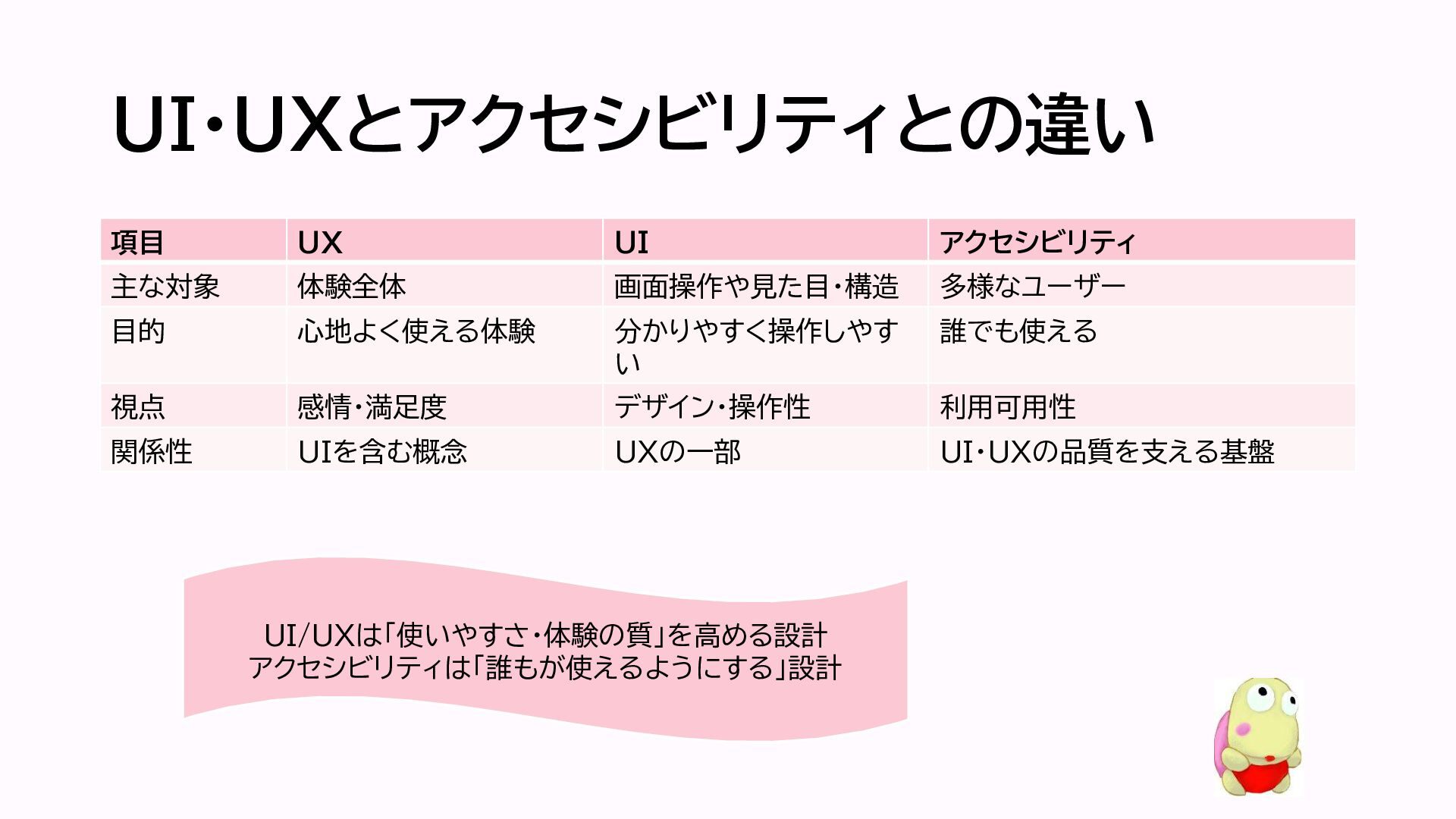 心地よく使える体験 分かりやすく操作しやす い 誰でも使える 視点 感情・満足度 デザイン・操作性 利用可用性 関係性 UIを含む概念 UXの一部 UI・UXの品質を支える基盤 UI/UXは「使いやすさ・体験の質」を高める設計 アクセシビリティは「誰もが使えるようにする」設計