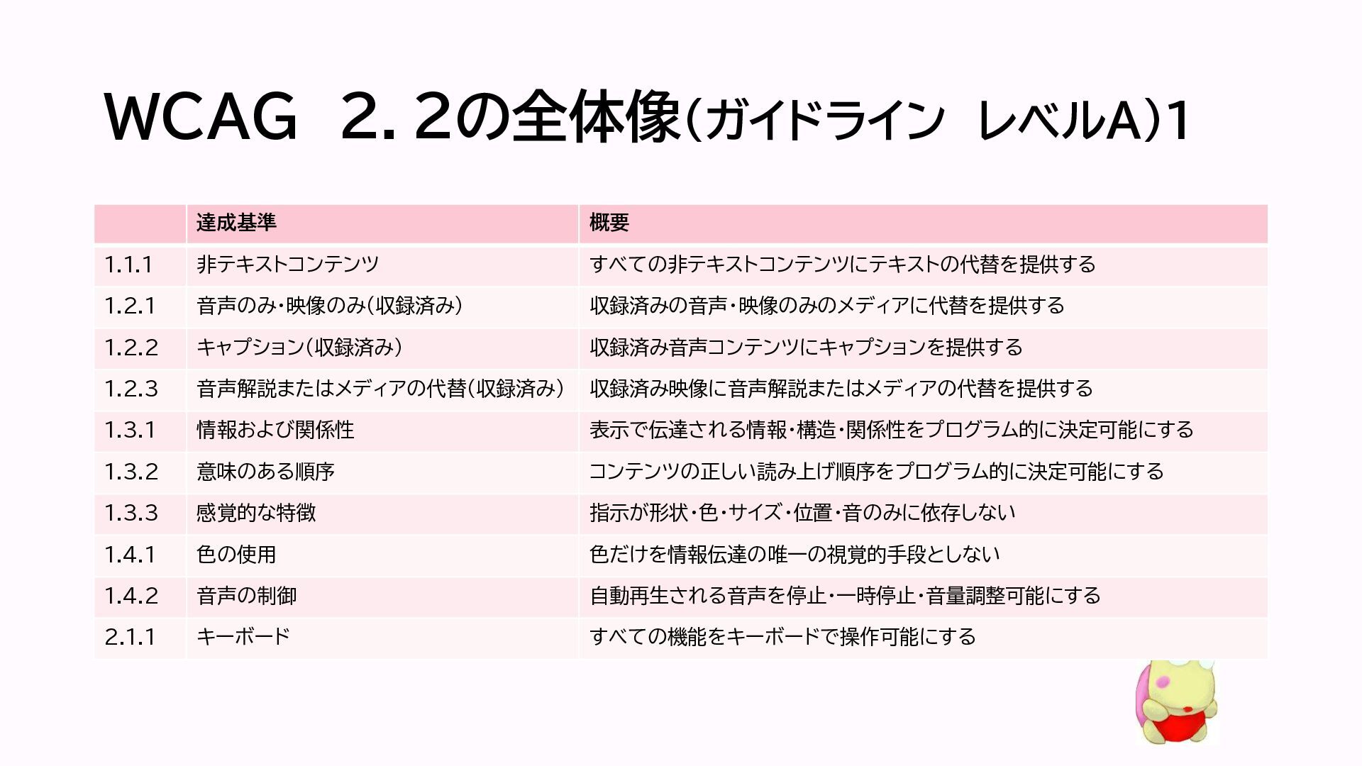 5. WCAG 2.2の全体像(ガイドライン レベルA)1 達成基準 概要 1.1.1 非テキストコンテンツ すべての非テキストコンテンツにテキストの代替を提供する 1.2.1 音声のみ・映像のみ(収録済み)