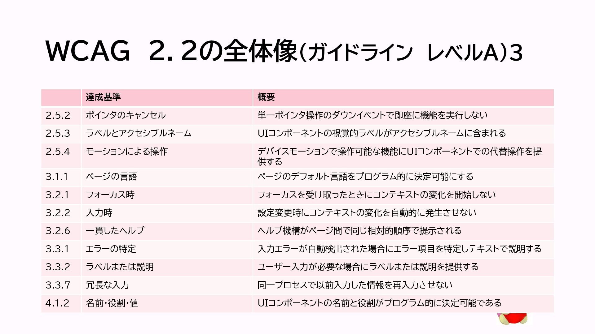7. WCAG 2.2の全体像(ガイドライン レベルA)3 達成基準 概要 2.5.2 ポインタのキャンセル 単一ポインタ操作のダウンイベントで即座に機能を実行しない 2.5.3 ラベルとアクセシブルネーム