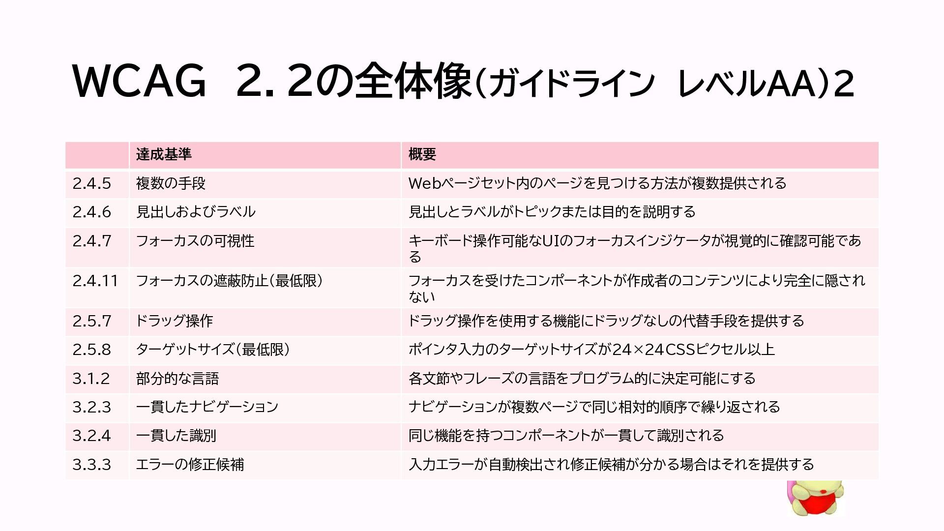 9. WCAG 2.2の全体像(ガイドライン レベルAA)2 達成基準 概要 2.4.5 複数の手段 Webページセット内のページを見つける方法が複数提供される 2.4.6 見出しおよびラベル