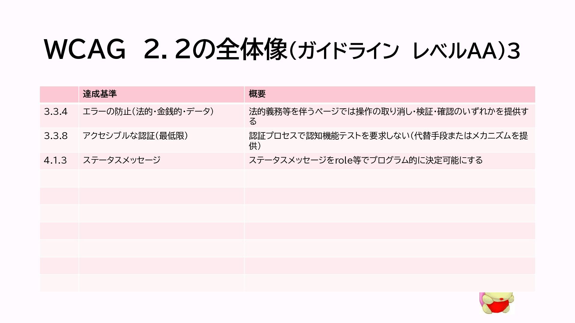 3.3.8 アクセシブルな認証(最低限) 限定的 必須 4.1.3 ステータスメッセージ 部分的 必須