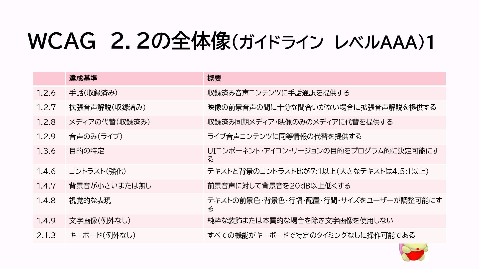 映像の前景音声の間に十分な間合いがない場合に拡張音声解説を提供する 1.2.8 メディアの代替(収録済み) 収録済み同期メディア・映像のみのメディアに代替を提供する 1.2.9 音声のみ(ライブ) ライブ音声コンテンツに同等情報の代替を提供する 1.3.6 目的の特定 UIコンポーネント・アイコン・リージョンの目的をプログラム的に決定可能にす る 1.4.6 コントラスト(強化) テキストと背景のコントラスト比が7:1以上(大きなテキストは4.5:1以上) 1.4.7 背景音が小さいまたは無し 前景音声に対して背景音を20dB以上低くする 1.4.8 視覚的な表現 テキストの前景色・背景色・行幅・配置・行間・サイズをユーザーが調整可能にす る 1.4.9 文字画像(例外なし) 純粋な装飾または本質的な場合を除き文字画像を使用しない 2.1.3 キーボード(例外なし) すべての機能がキーボードで特定のタイミングなしに操作可能である