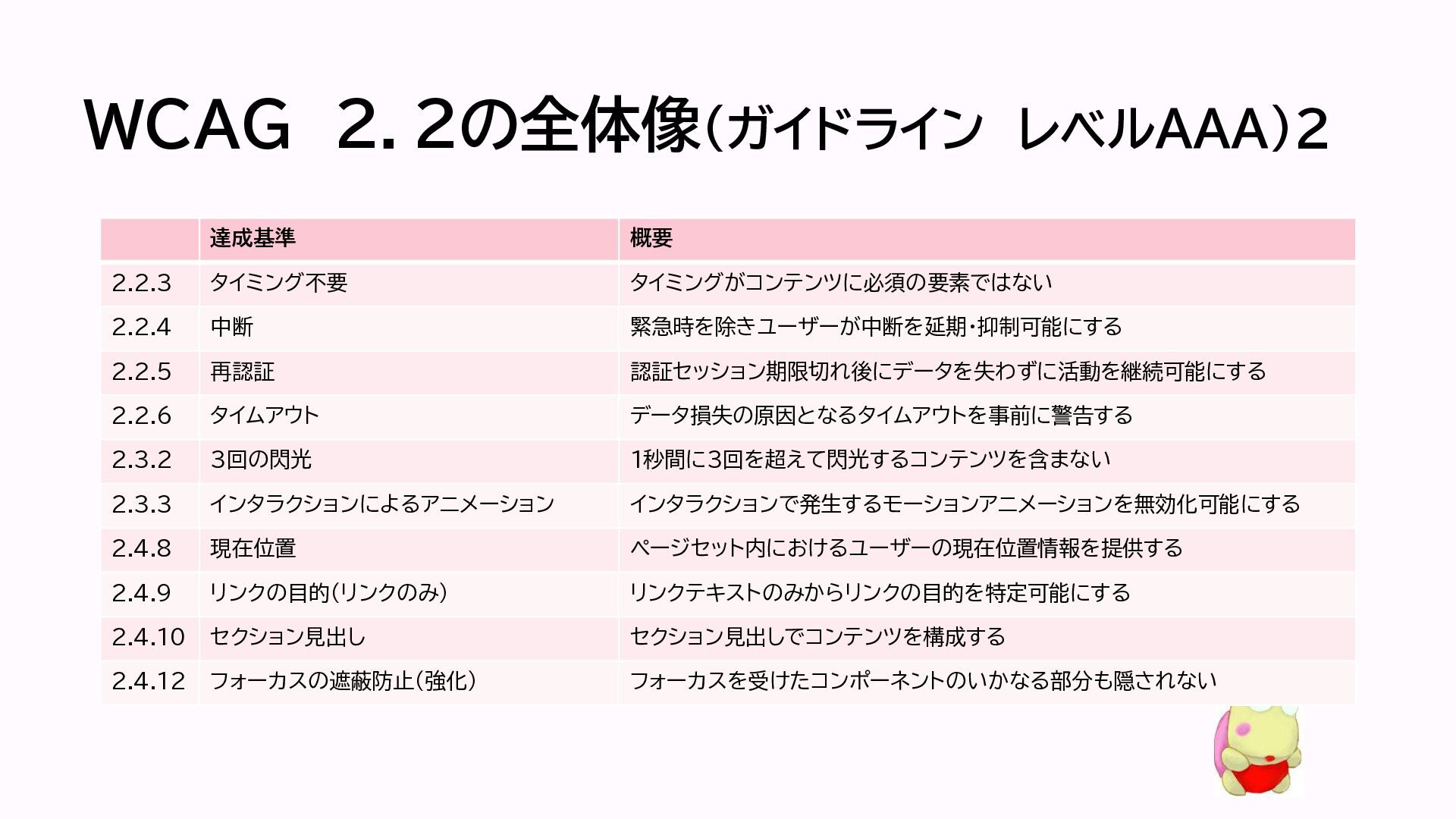 12. WCAG 2.2の全体像(ガイドライン レベルAAA)2 達成基準 概要 2.2.3 タイミング不要 タイミングがコンテンツに必須の要素ではない 2.2.4 中断