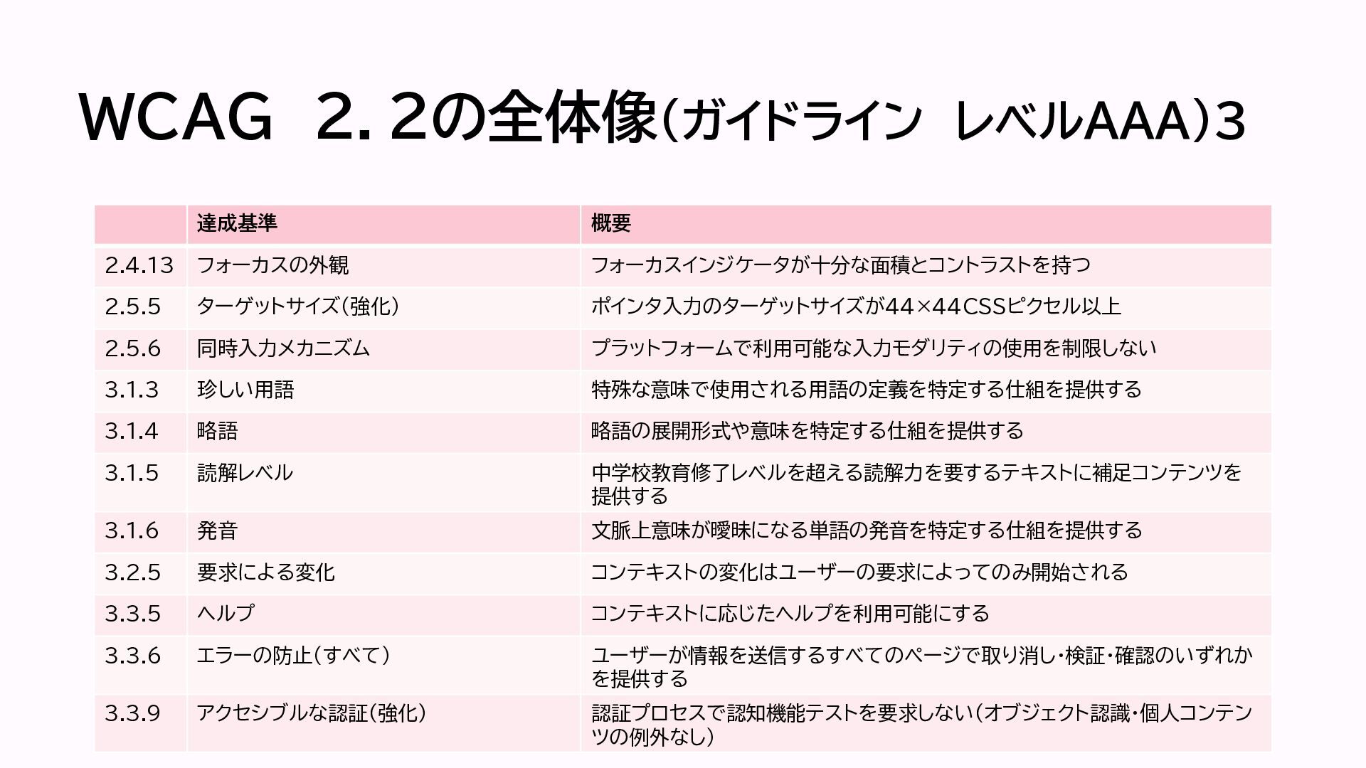 ポインタ入力のターゲットサイズが44×44CSSピクセル以上 2.5.6 同時入力メカニズム プラットフォームで利用可能な入力モダリティの使用を制限しない 3.1.3 珍しい用語 特殊な意味で使用される用語の定義を特定する仕組を提供する 3.1.4 略語 略語の展開形式や意味を特定する仕組を提供する 3.1.5 読解レベル 中学校教育修了レベルを超える読解力を要するテキストに補足コンテンツを 提供する 3.1.6 発音 文脈上意味が曖昧になる単語の発音を特定する仕組を提供する 3.2.5 要求による変化 コンテキストの変化はユーザーの要求によってのみ開始される 3.3.5 ヘルプ コンテキストに応じたヘルプを利用可能にする 3.3.6 エラーの防止(すべて) ユーザーが情報を送信するすべてのページで取り消し・検証・確認のいずれか を提供する 3.3.9 アクセシブルな認証(強化) 認証プロセスで認知機能テストを要求しない(オブジェクト認識・個人コンテン ツの例外なし)