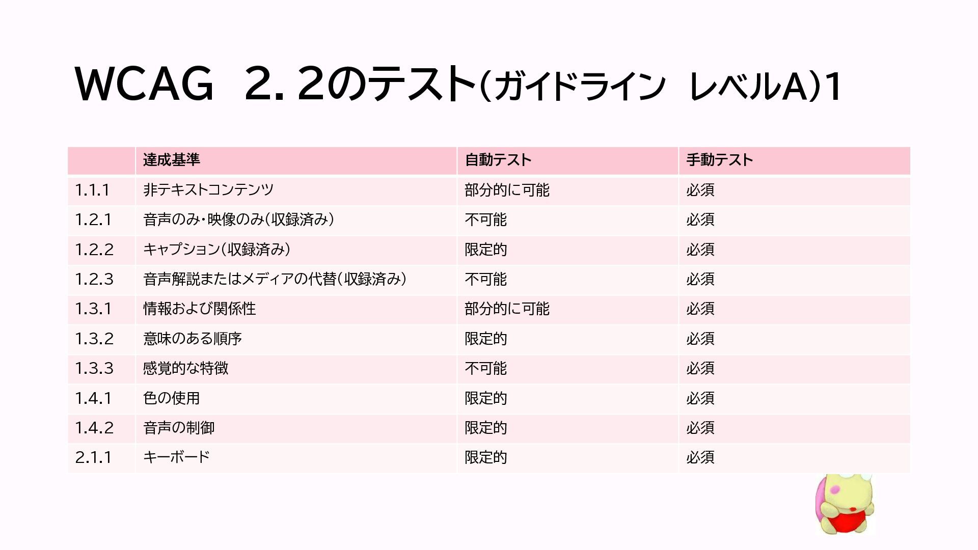 21. WCAG 2.2のテスト(ガイドライン レベルAAA)1 達成基準 自動テスト 手動テスト 1.2.6 手話(収録済み) 不可能 必須
