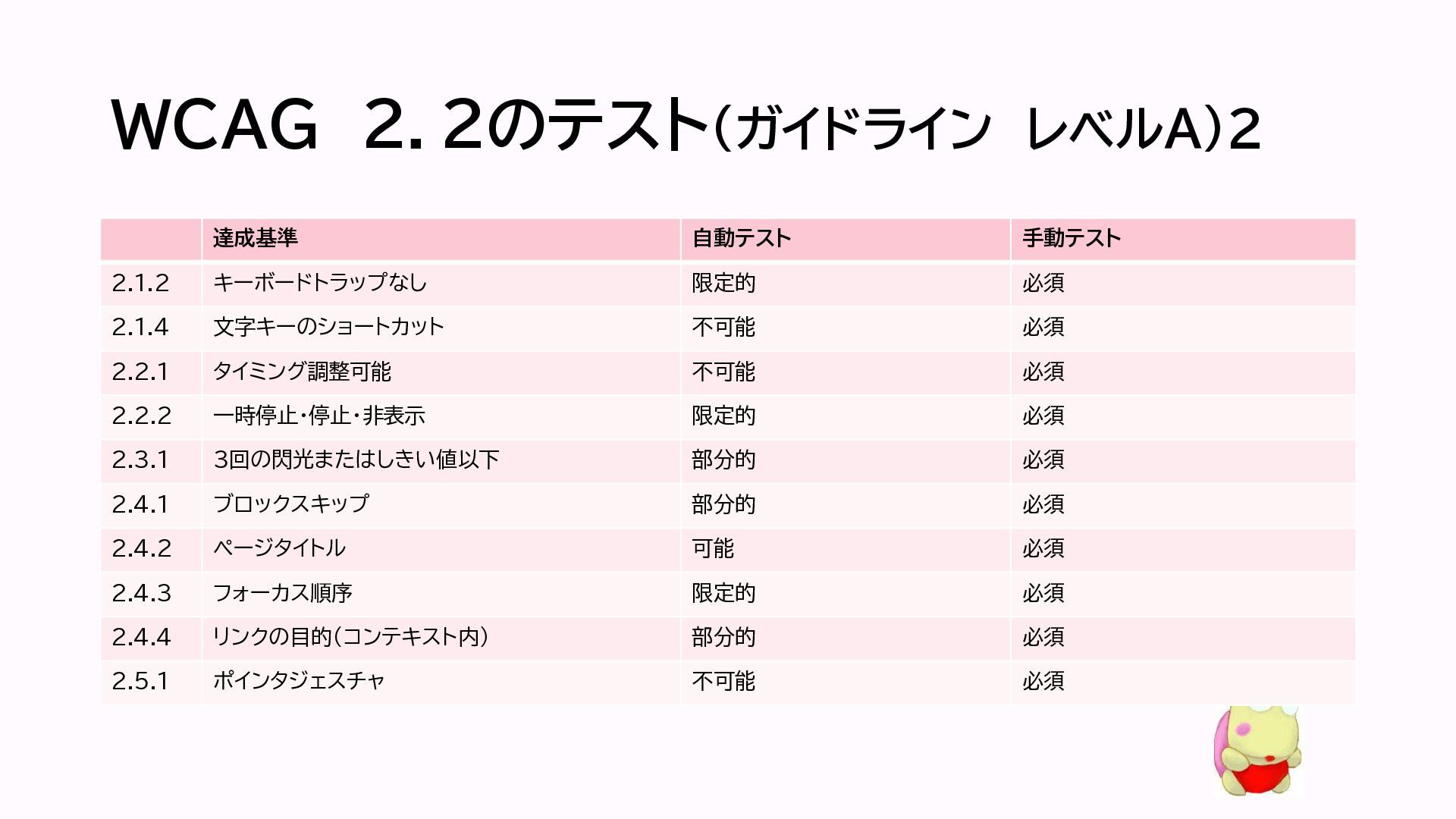 2.1.4 文字キーのショートカット 不可能 必須 2.2.1 タイミング調整可能 不可能 必須 2.2.2 一時停止・停止・非表示 限定的 必須 2.3.1 3回の閃光またはしきい値以下 部分的 必須 2.4.1 ブロックスキップ 部分的 必須 2.4.2 ページタイトル 可能 必須 2.4.3 フォーカス順序 限定的 必須 2.4.4 リンクの目的(コンテキスト内) 部分的 必須 2.5.1 ポインタジェスチャ 不可能 必須
