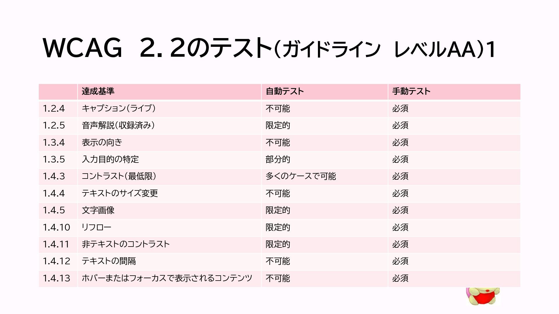 1.2.5 音声解説(収録済み) 限定的 必須 1.3.4 表示の向き 不可能 必須 1.3.5 入力目的の特定 部分的 必須 1.4.3 コントラスト(最低限) 多くのケースで可能 必須 1.4.4 テキストのサイズ変更 不可能 必須 1.4.5 文字画像 限定的 必須 1.4.10 リフロー 限定的 必須 1.4.11 非テキストのコントラスト 限定的 必須 1.4.12 テキストの間隔 不可能 必須 1.4.13 ホバーまたはフォーカスで表示されるコンテンツ 不可能 必須