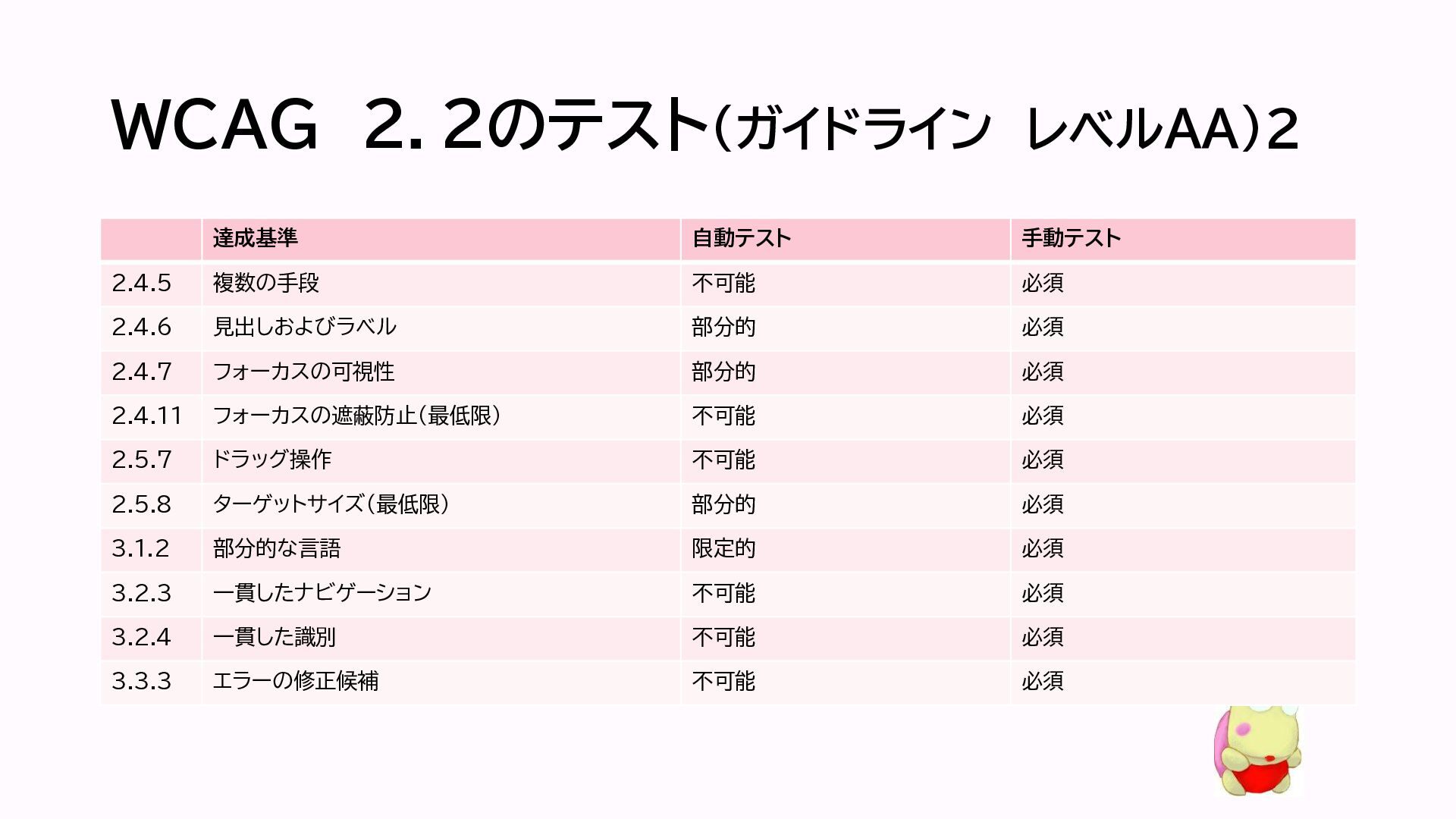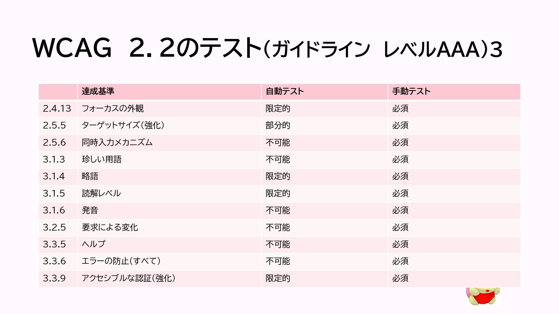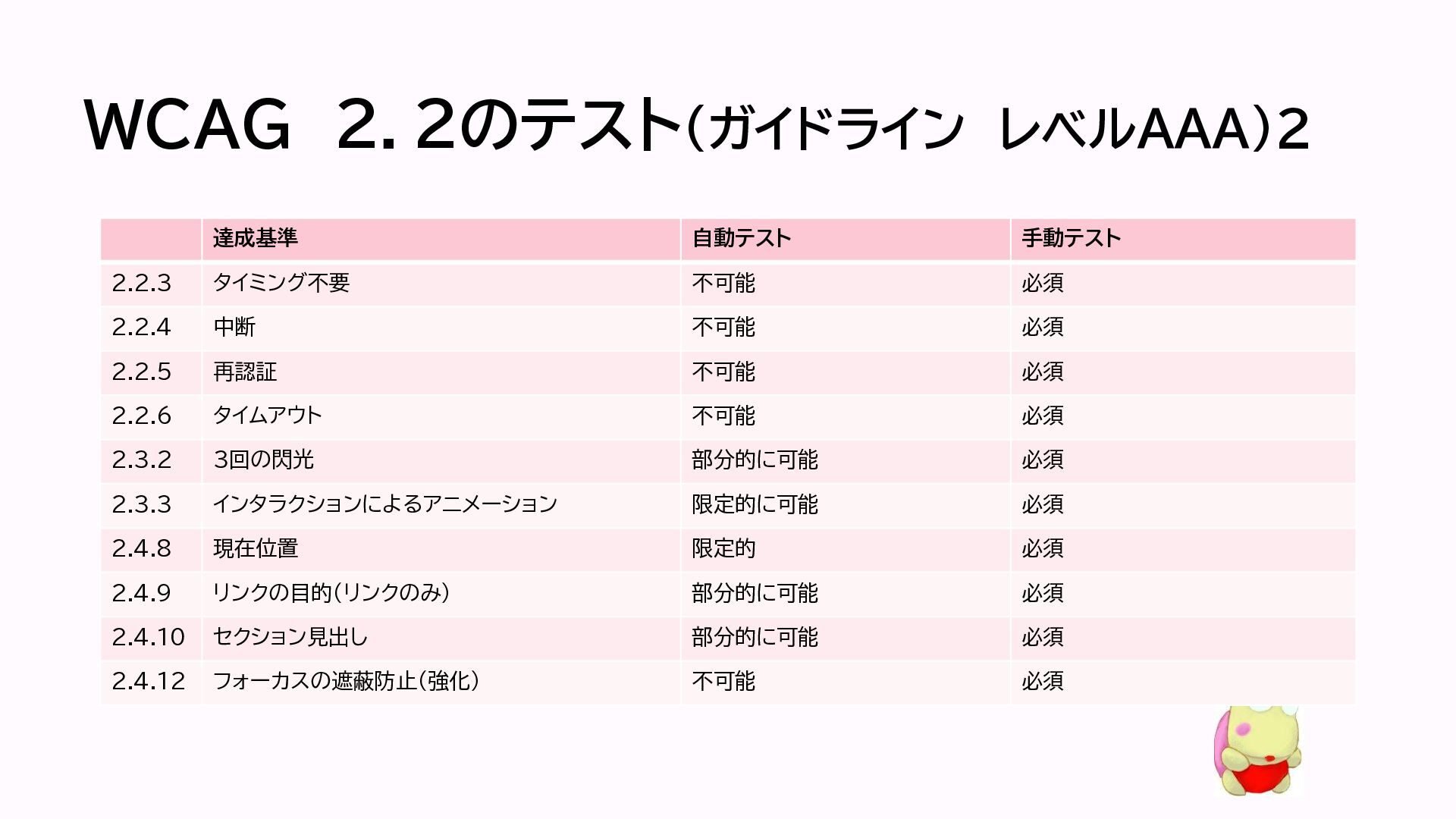 22. WCAG 2.2のテスト(ガイドライン レベルAAA)2 達成基準 自動テスト 手動テスト 2.2.3 タイミング不要 不可能 必須
