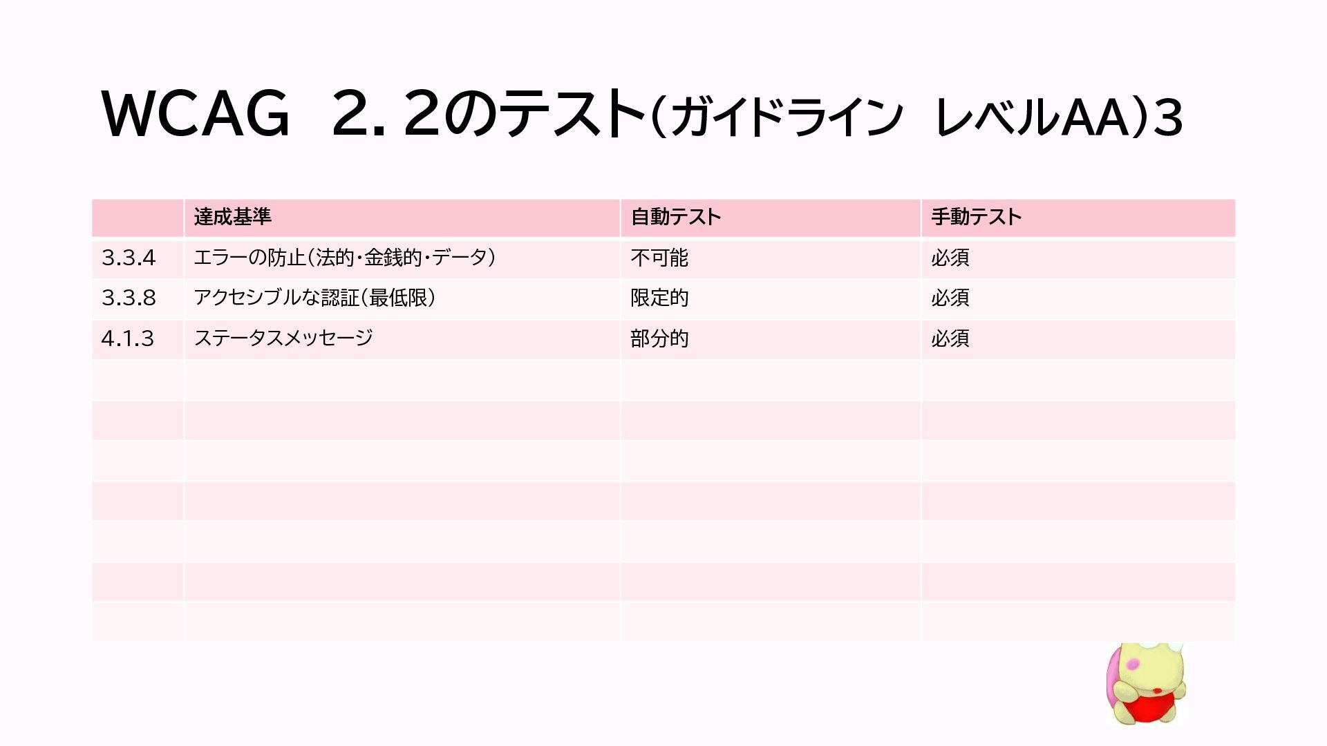 20. WCAG 2.2のテスト(ガイドライン レベルAA)3 達成基準 自動テスト 手動テスト 3.3.4 エラーの防止(法的・金銭的・データ) 不可能 必須