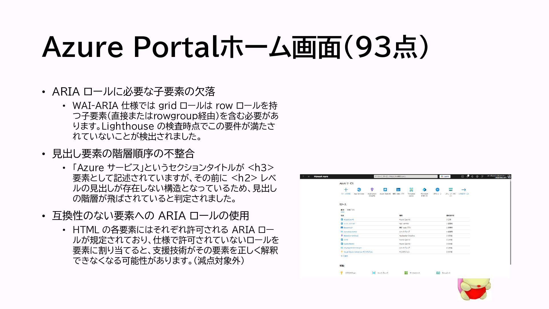 row ロールを持 つ子要素(直接またはrowgroup経由)を含む必要があ ります。Lighthouse の検査時点でこの要件が満たさ れていないことが検出されました。 • 見出し要素の階層順序の不整合 • 「Azure サービス」というセクションタイトルが <h3> 要素として記述されていますが、その前に <h2> レベ ルの見出しが存在しない構造となっているため、見出し の階層が飛ばされていると判定されました。 • 互換性のない要素への ARIA ロールの使用 • HTML の各要素にはそれぞれ許可される ARIA ロー ルが規定されており、仕様で許可されていないロールを 要素に割り当てると、支援技術がその要素を正しく解釈 できなくなる可能性があります。(減点対象外)