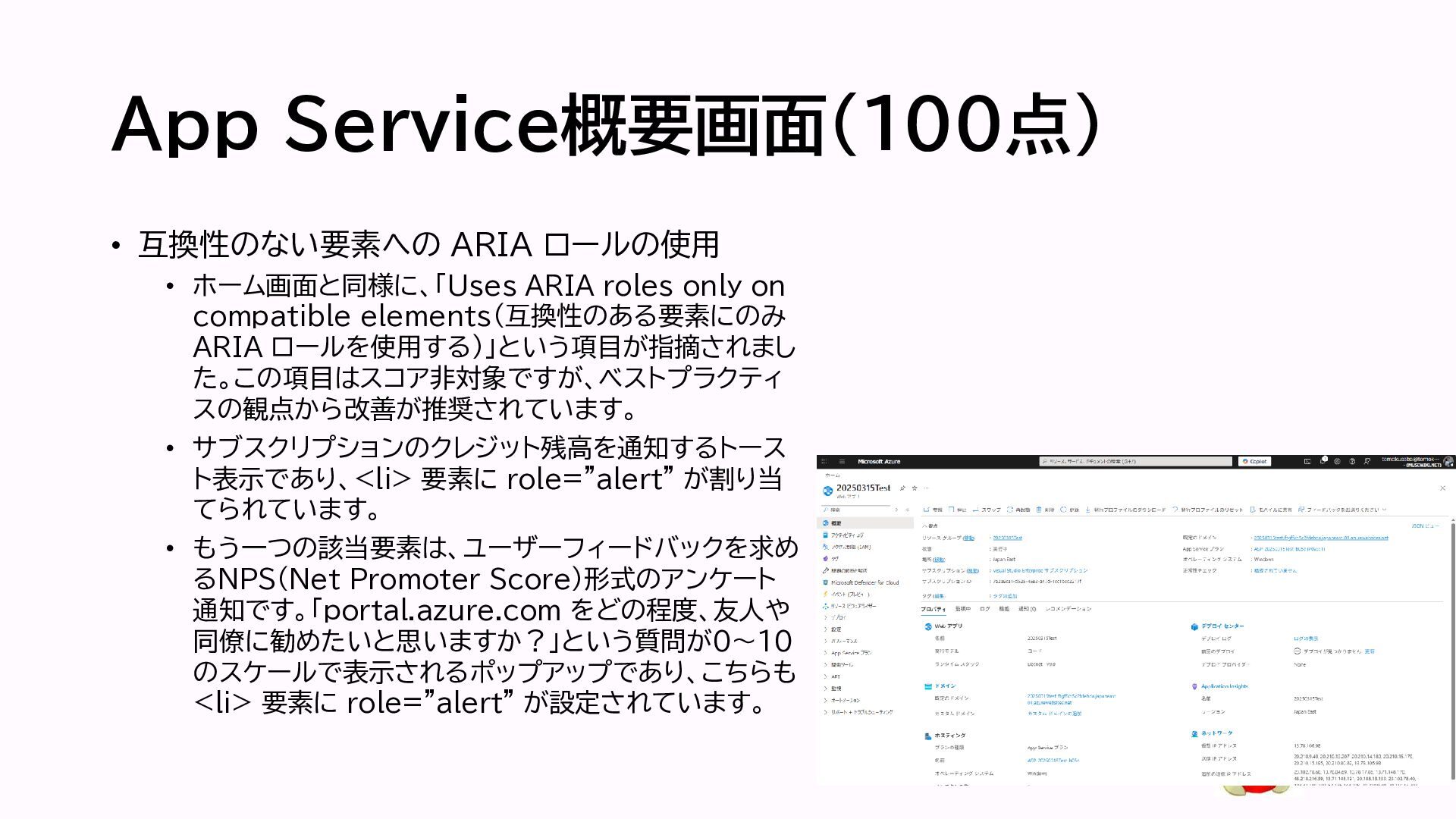 only on compatible elements(互換性のある要素にのみ ARIA ロールを使用する)」という項目が指摘されまし た。この項目はスコア非対象ですが、ベストプラクティ スの観点から改善が推奨されています。 • サブスクリプションのクレジット残高を通知するトース ト表示であり、<li> 要素に role="alert" が割り当 てられています。 • もう一つの該当要素は、ユーザーフィードバックを求め るNPS(Net Promoter Score)形式のアンケート 通知です。「portal.azure.com をどの程度、友人や 同僚に勧めたいと思いますか?」という質問が0〜10 のスケールで表示されるポップアップであり、こちらも <li> 要素に role="alert" が設定されています。