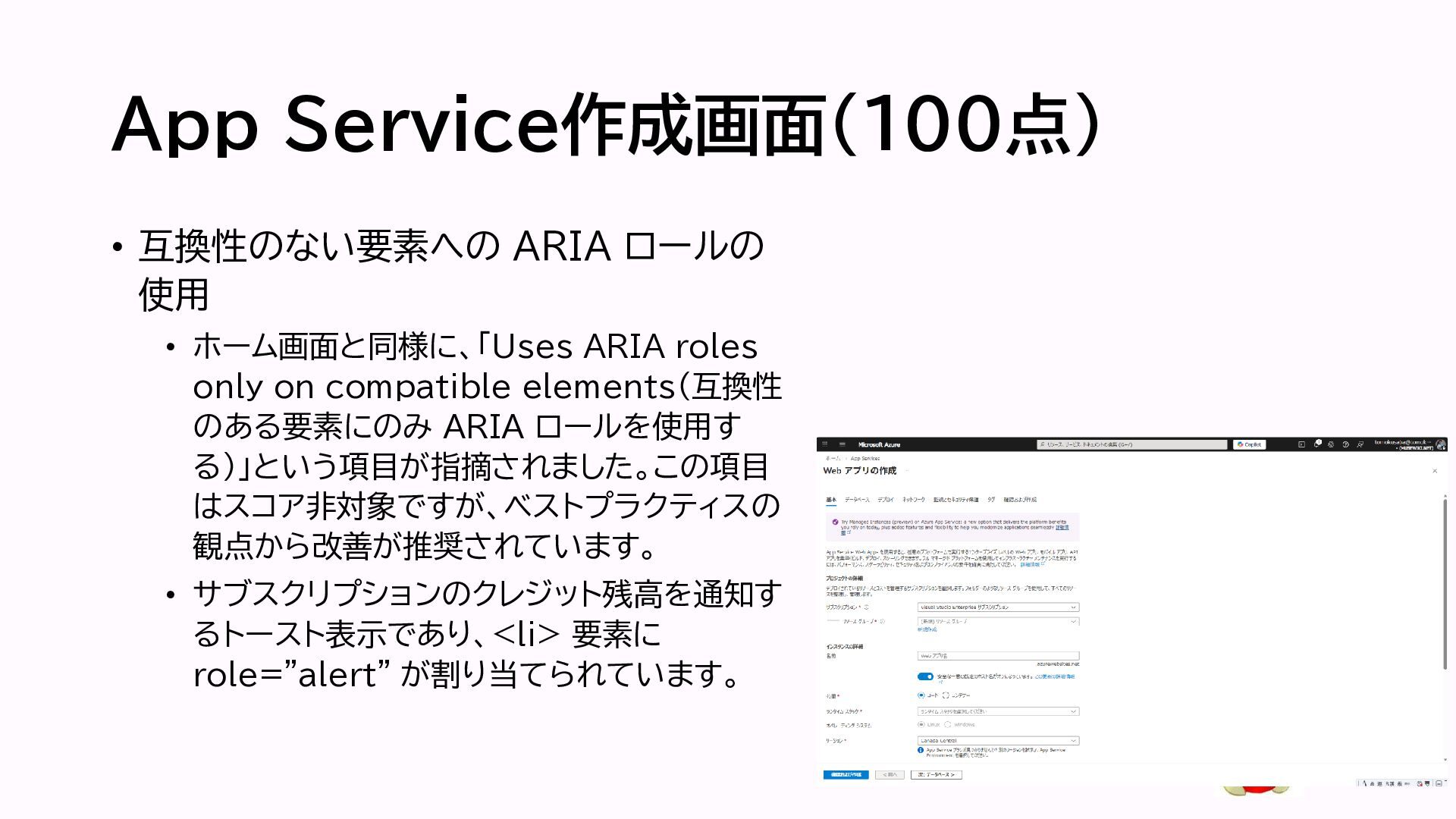 26. App Service作成画面(100点) • 互換性のない要素への ARIA ロールの 使用 • ホーム画面と同様に、「Uses ARIA