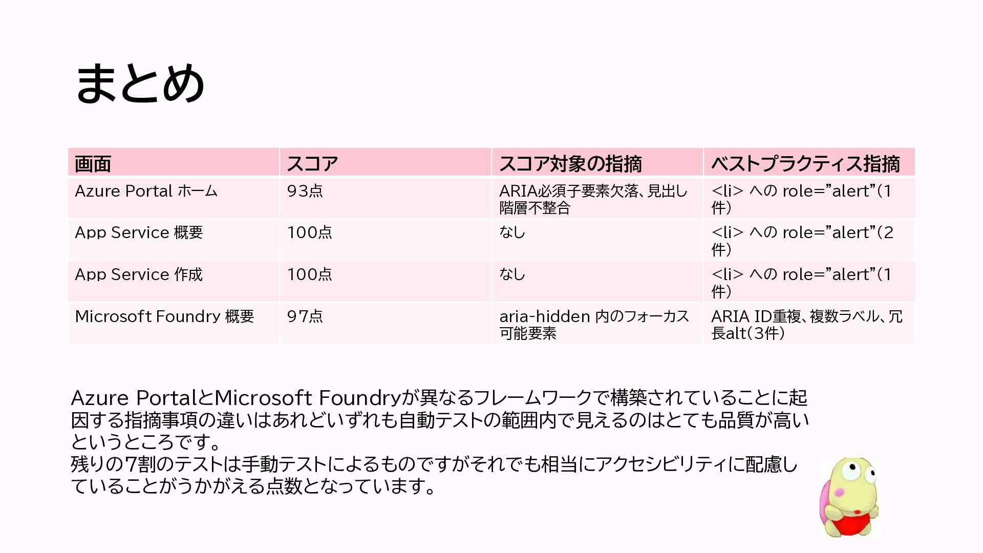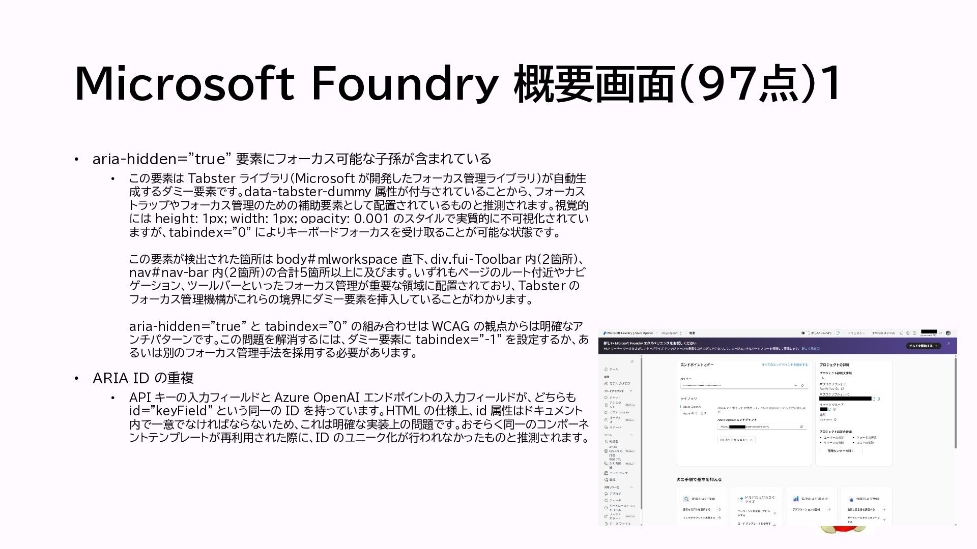 階層不整合 <li> への role="alert"(1件) App Service 概要 100点 なし <li> への role="alert"(2件) App Service 作成 100点 なし <li> への role="alert"(1件) Microsoft Foundry 概要 97点 aria-hidden 内のフォーカス 可能要素 ARIA ID重複、複数ラベル、冗長 alt(3件) Azure PortalとMicrosoft Foundryが異なるフレームワークで構築されていることに起 因する指摘事項の違いはあれどいずれも自動テストの範囲内で見えるのはとても品質が高い というところです。 残りの7割のテストは手動テストによるものですがそれでも相当にアクセシビリティに配慮し ていることがうかがえる点数となっています。