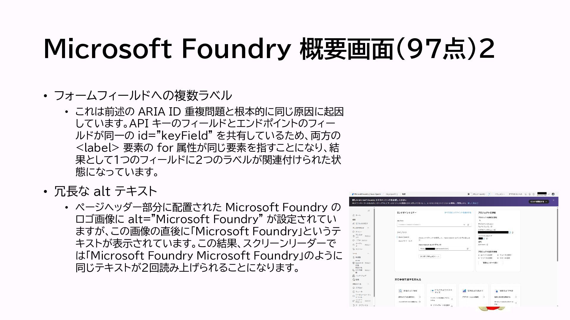 28. Microsoft Foundry 概要画面(97点)2 • フォームフィールドへの複数ラベル • これは前述の ARIA ID 重複問題と根本的に同じ原因に起因