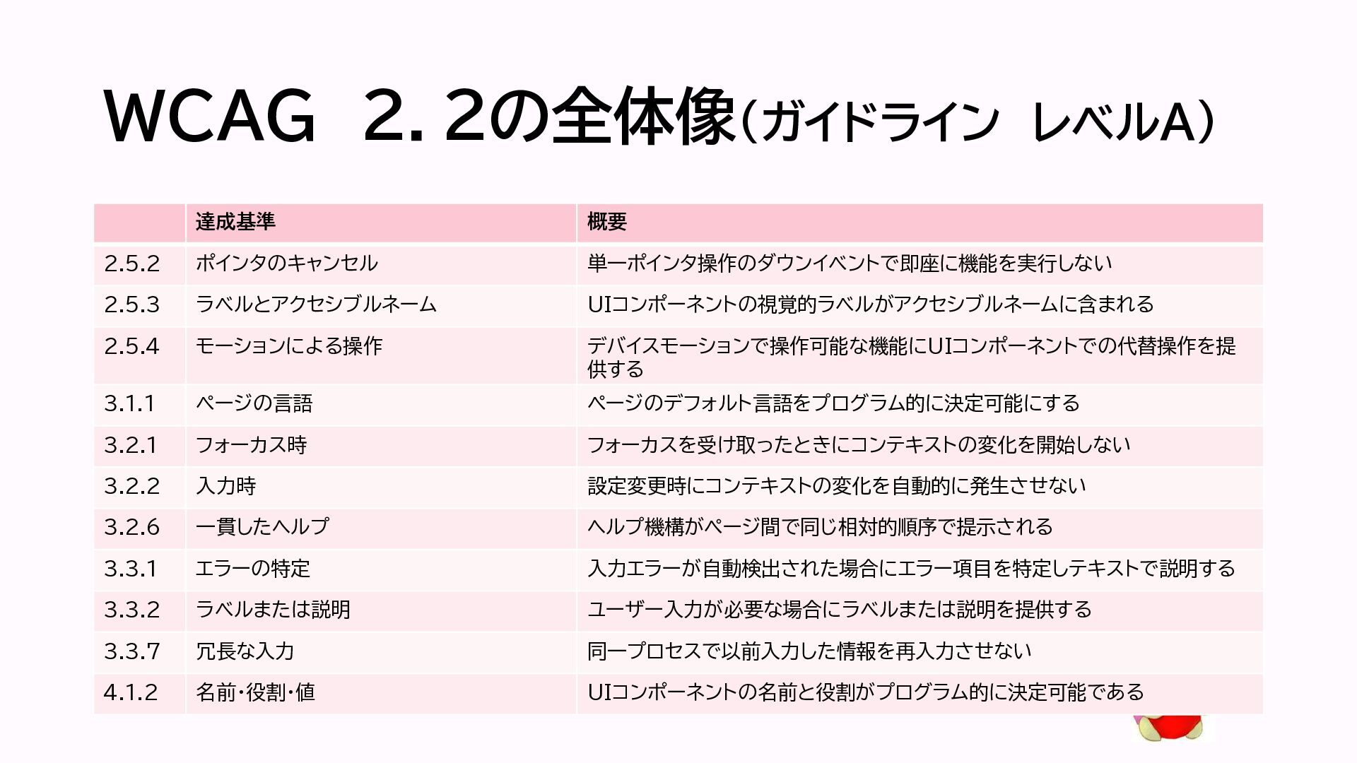 WCAG 2.2の全体像(ガイドライン レベルA) 達成基準 概要 2.5.2 ポインタのキャンセル 単一ポインタ操作のダウンイベントで即座に機能を実行しない 2.5.3 ラベルとアクセシブルネーム