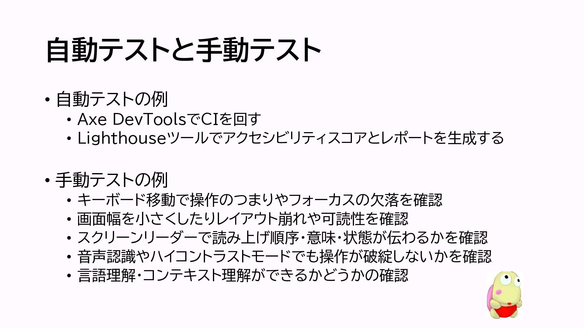 自動テストと手動テスト • 自動テストの例 • Axe DevToolsでCIを回す • Lighthouseツールでアクセシビリティスコアとレポートを生成する • 手動テストの例