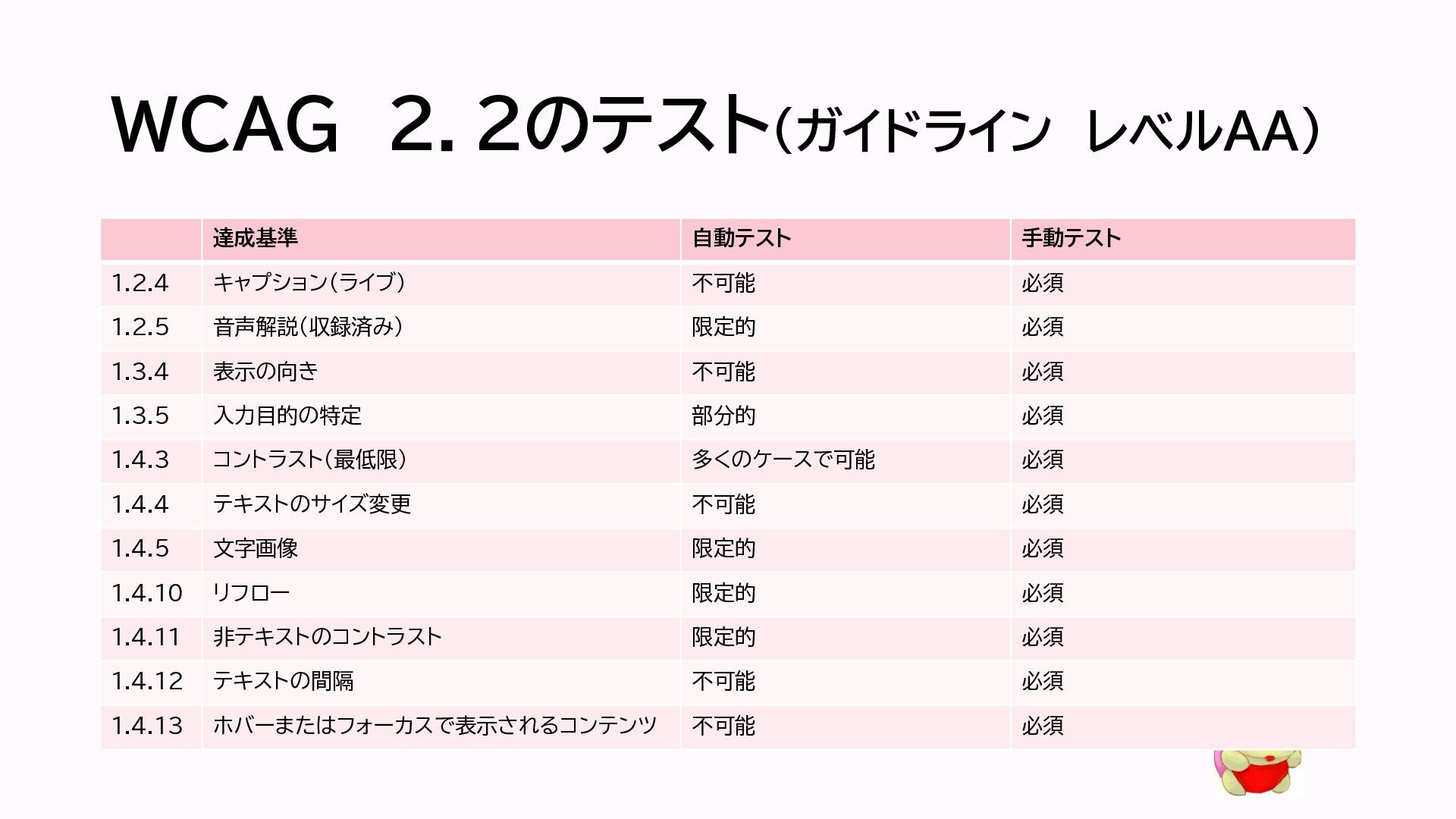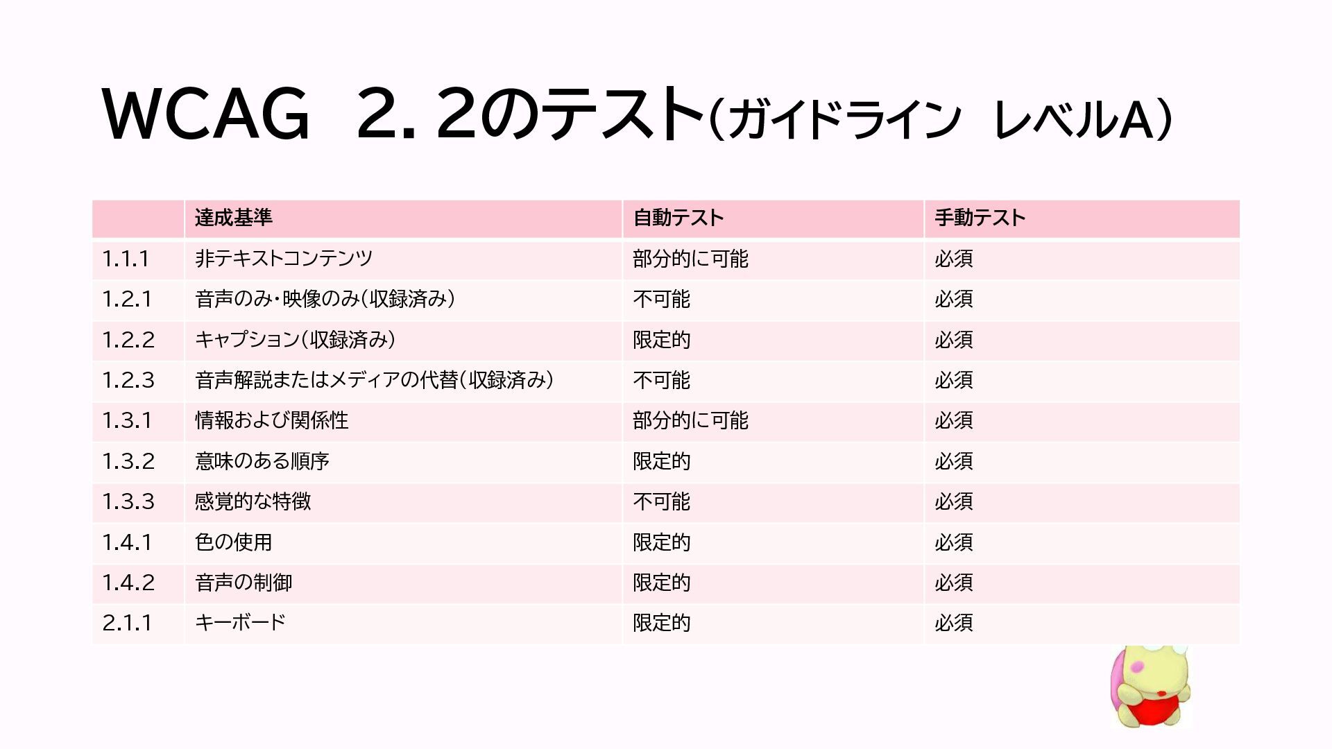 WCAG 2.2のテスト(ガイドライン レベルA) 達成基準 自動テスト 手動テスト 1.1.1 非テキストコンテンツ 部分的に可能 必須