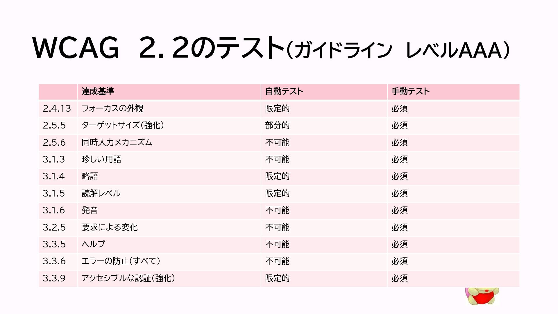WCAG 2.2のテスト(ガイドライン レベルAAA) 達成基準 自動テスト 手動テスト 2.2.3 タイミング不要 不可能 必須