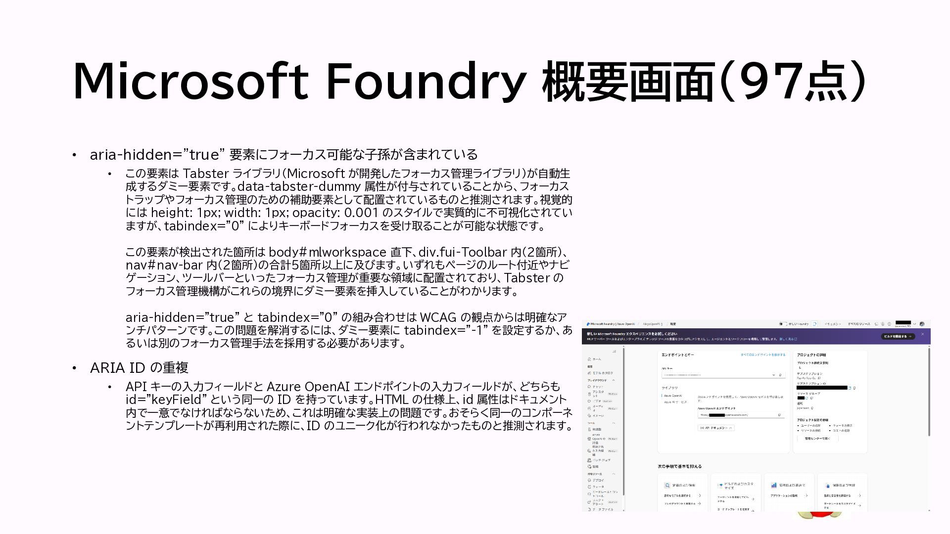 が開発したフォーカス管理ライブラリ)が自動生 成するダミー要素です。data-tabster-dummy 属性が付与されていることから、フォーカス トラップやフォーカス管理のための補助要素として配置されているものと推測されます。視覚的 には height: 1px; width: 1px; opacity: 0.001 のスタイルで実質的に不可視化されてい ますが、tabindex="0" によりキーボードフォーカスを受け取ることが可能な状態です。 この要素が検出された箇所は body#mlworkspace 直下、div.fui-Toolbar 内(2箇所)、 nav#nav-bar 内(2箇所)の合計5箇所以上に及びます。いずれもページのルート付近やナビ ゲーション、ツールバーといったフォーカス管理が重要な領域に配置されており、Tabster の フォーカス管理機構がこれらの境界にダミー要素を挿入していることがわかります。 aria-hidden="true" と tabindex="0" の組み合わせは WCAG の観点からは明確なア ンチパターンです。この問題を解消するには、ダミー要素に tabindex="-1" を設定するか、あ るいは別のフォーカス管理手法を採用する必要があります。 • ARIA ID の重複 • API キーの入力フィールドと Azure OpenAI エンドポイントの入力フィールドが、どちらも id="keyField" という同一の ID を持っています。HTML の仕様上、id 属性はドキュメント 内で一意でなければならないため、これは明確な実装上の問題です。おそらく同一のコンポーネ ントテンプレートが再利用された際に、ID のユニーク化が行われなかったものと推測されます。